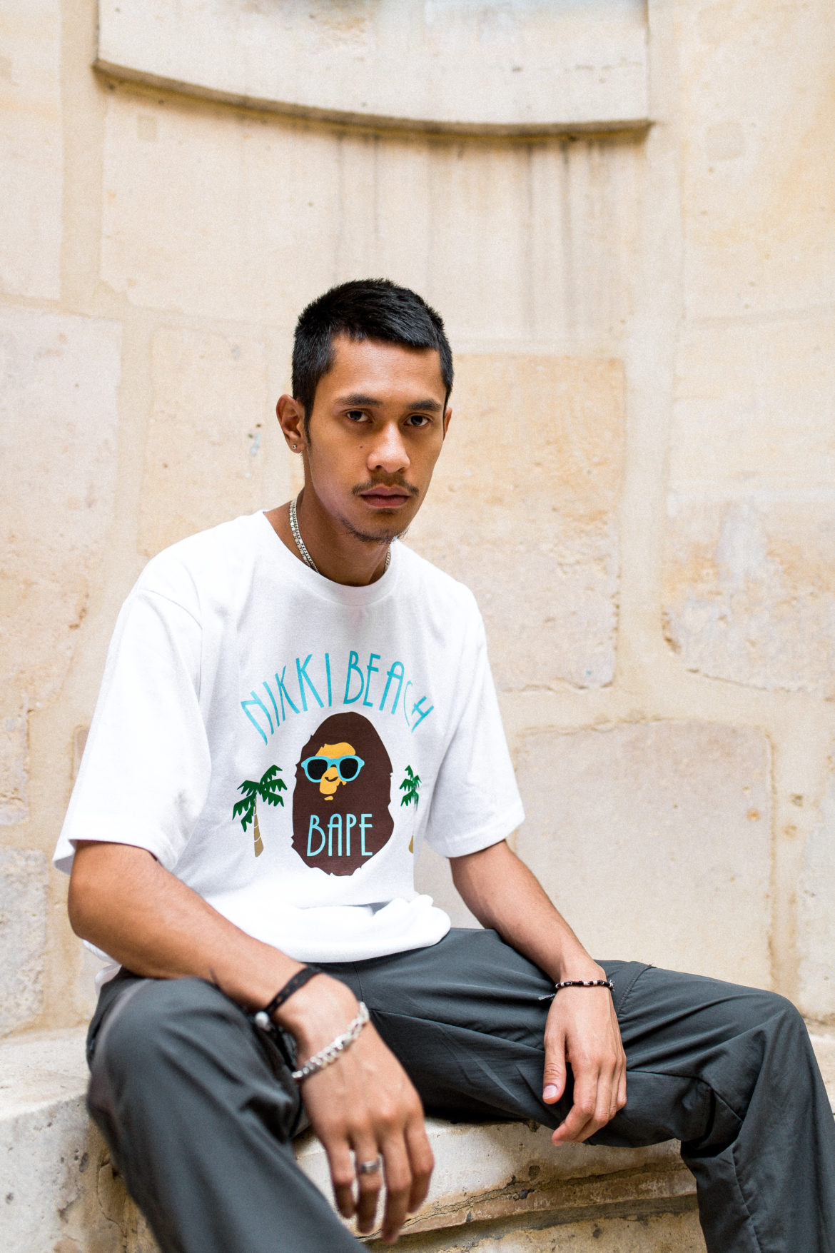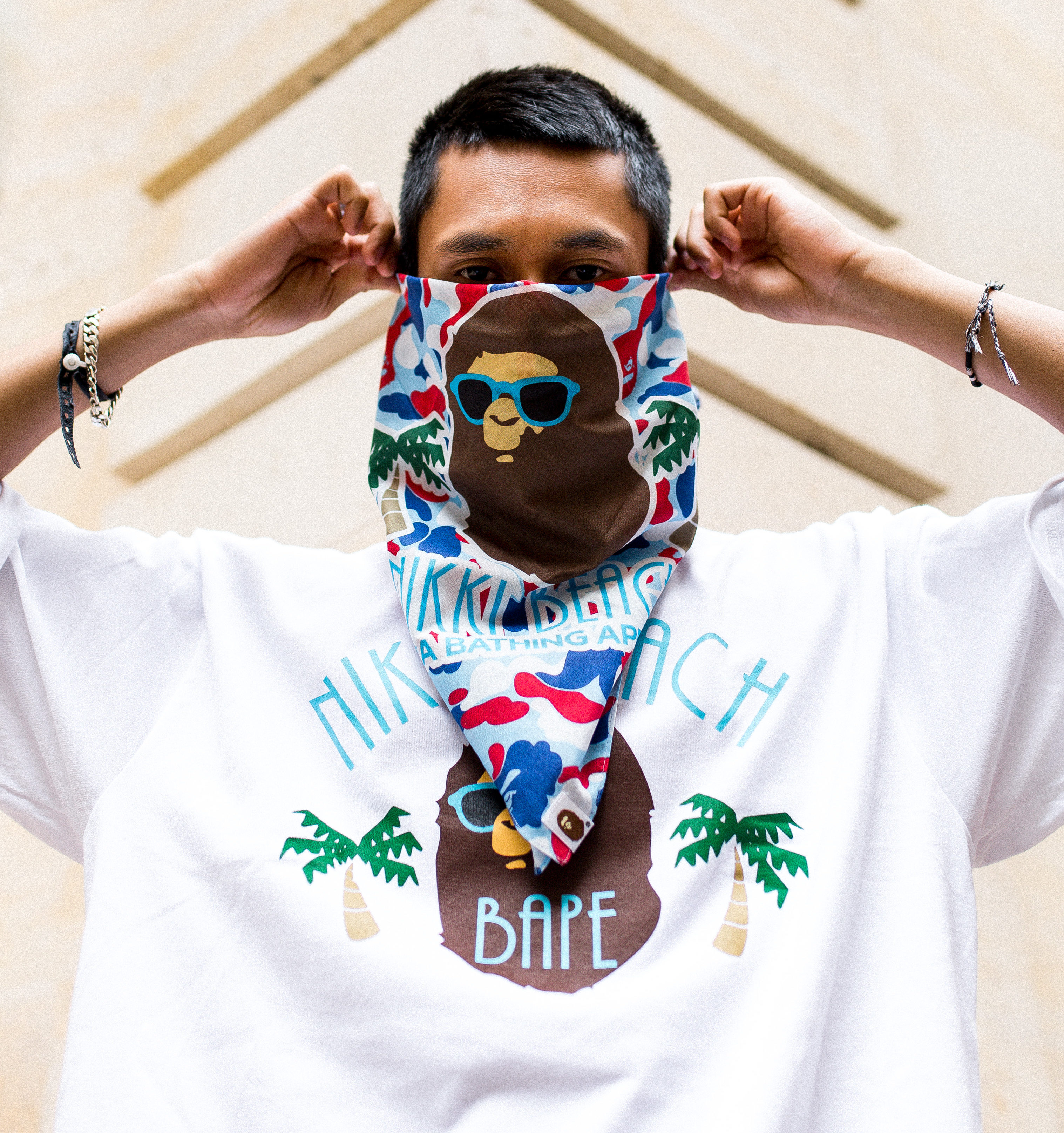 Ils ont également reçu ces deux tee-shirts Bape. Le premier est un tee en collaboration avec le Nikki Beach, qui est sorti exclusivement lors du pop-up Bape au Nikki Beach à Saint Tropez en juillet 2019. Vous pouvez le retrouver au prix de 300 € en boutique. Le second tee-shirt est un ABC Ape Face Tee issu de la collection SS2018. Il est disponible à la fois en boutique et sur leur site internet pour 180 €.