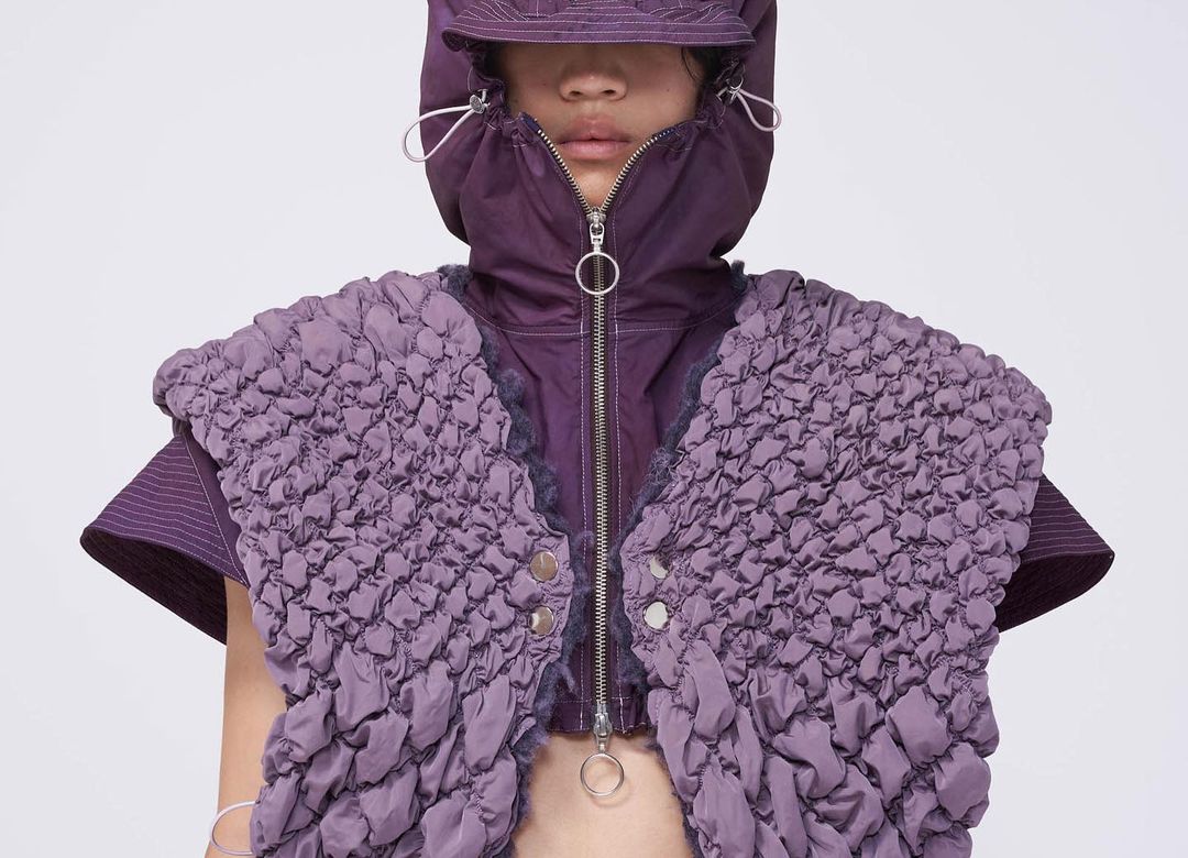 Ce prêt à porter artisanal est issu d’une technique de fabrication qui permet de confectionner des pièces matelassées rétrécissables ou étirables. S’amènent ensuite des tissus en nylon qui s’accompagnent tantôt de laçages élastiques tantôt de fermetures à glissières dans le but de varier matière et forme. Avant garde et utilitaire, la garde robe du jeune épouse n’importe quelle silhouette.