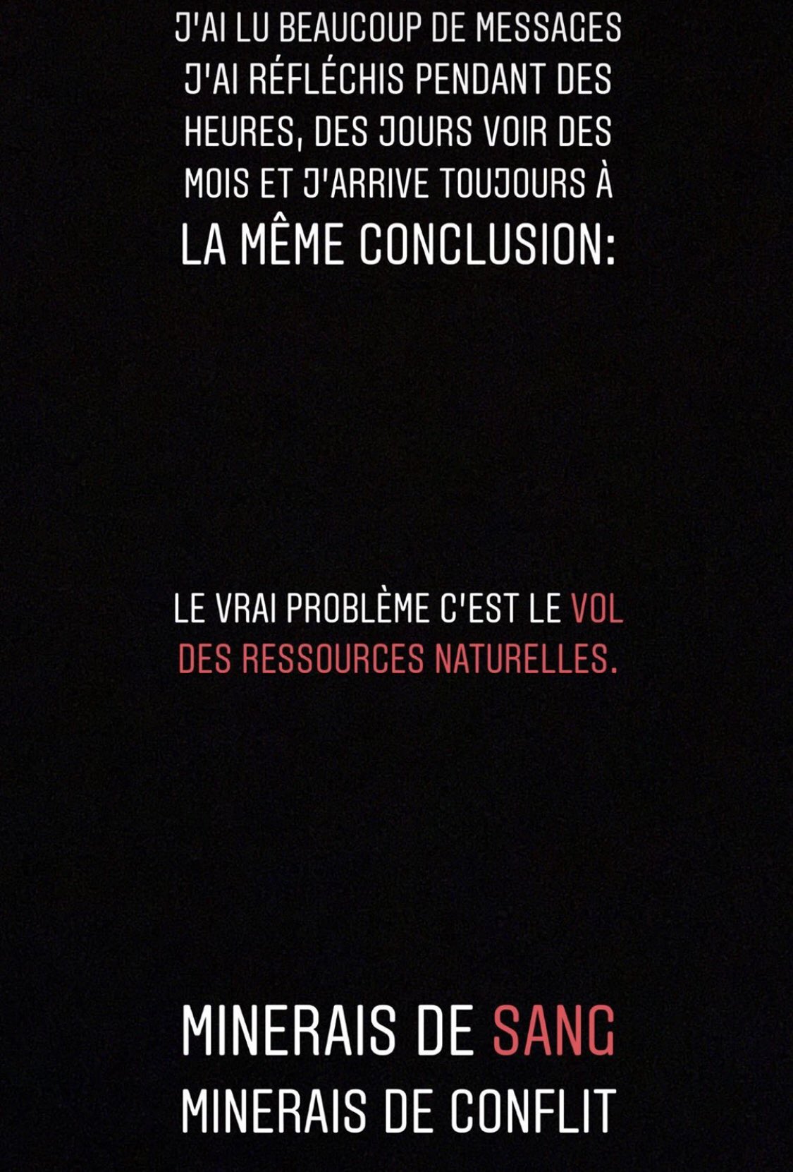 «J’ai lu beaucoup de messages, j’ai réfléchi pendant des heures, des jours voire des mois et j’arrive toujours à la même conclusion : le vrai problème, c’est le vol des ressources naturelles. Minerais de sang, minerais de conflit» sont les paroles du rappeur partagés dans sa story Instagram. Il a par la suite dévoilé le logo et le nom de sa fondation.