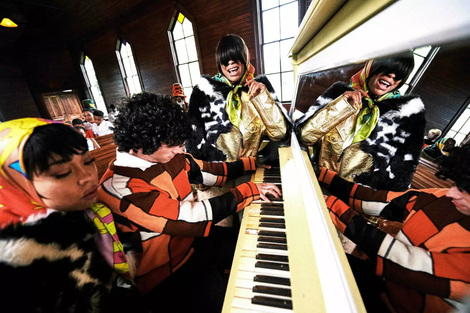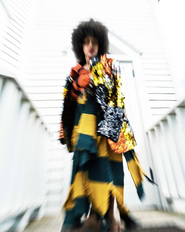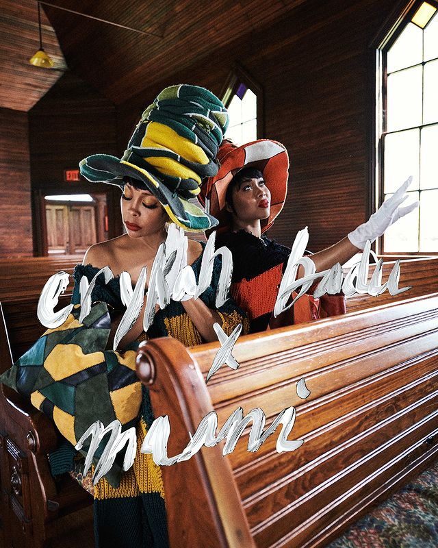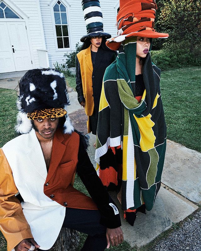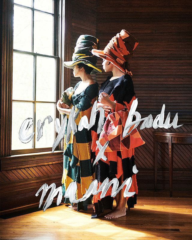 La collection lie ce qui apparaît comme deux mondes différents. Celui de Marni réputé pour l’exubérance de ses imprimées et ses couleurs vives fusionné à l’héritage éclectique, spirituel et bohémien de Mme Erykah Badu. Ainsi, naît une ligne qui capture la soul et le maximalisme pour en faire des tricots, patchworks et chapeaux haut de forme qui provoquent de la sensation et une sensibilité créative.