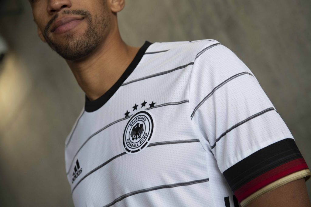 Du côté de l’Allemagne, Adidas a opté pour un maillot blanc avec des rayures noires effet coup de pinceau. Les manches sont également ornées de bandes noires, bordeaux et dorées, toujours en référence au drapeau allemand.