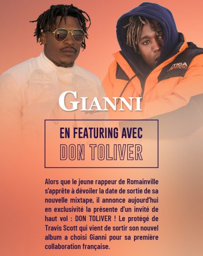 Après son nouveau clip Larmes Noires, Gianni ne s’arrête pas là et sortira sa première mixtape mi-avril. Après deux EP composés uniquement de titres en solo, il s’offre cette fois-ci un featuring d’exception avec Don Toliver, à noter qu’il s’agit du premier feat français qu’accorde l’artiste texan. Artiste incontournable de ce début d’année dans le rap US, son dernier album Heaven Or Hell confirme l’énorme attente autour de lui après le morceau Can’t Say en featuring avec Travis Scott sur l’album de ce dernier. Signé dans son label Jackboys, Don Toliver apparaît comme l’une des futures têtes d’affiche du rap américain, surtout depuis le succès de son dernier projet. Le track s’intitulera «