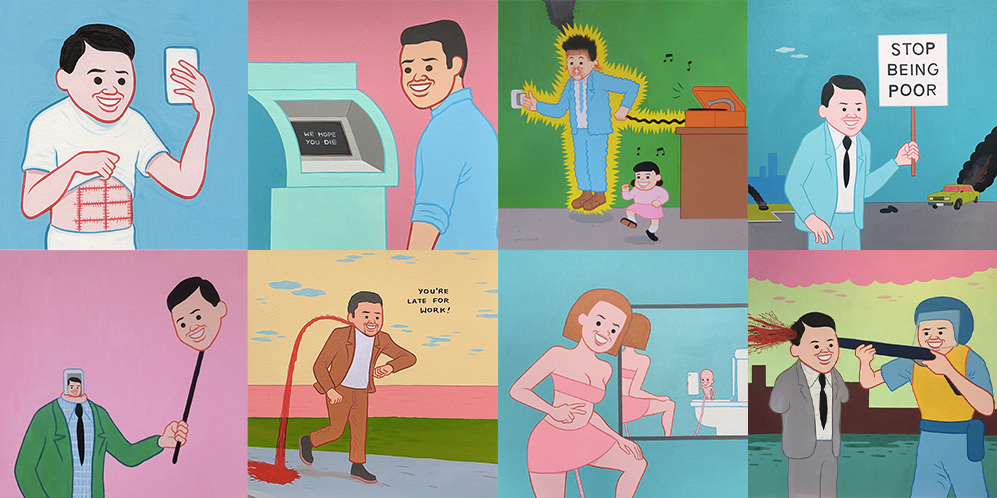 Pour amplifier le tout, ses satires sont représentées dans des formes simples, arrondies, et aux teintes vives et colorées. Un mélange total entre naïf et trash qui a des airs d’oxymores.