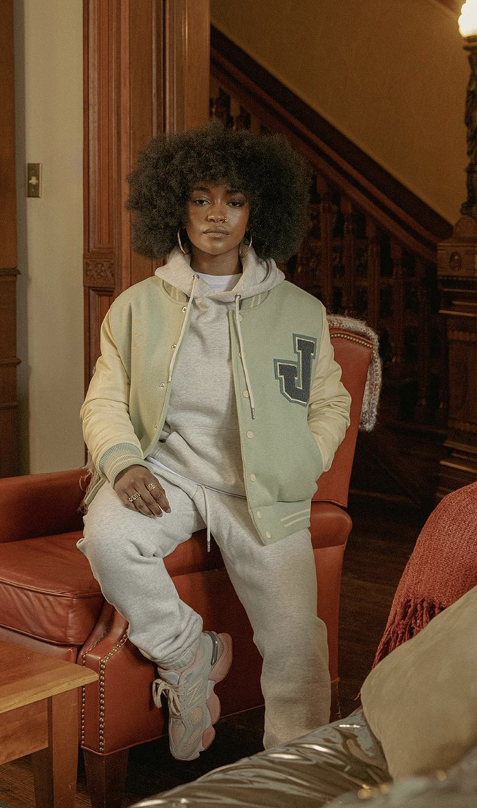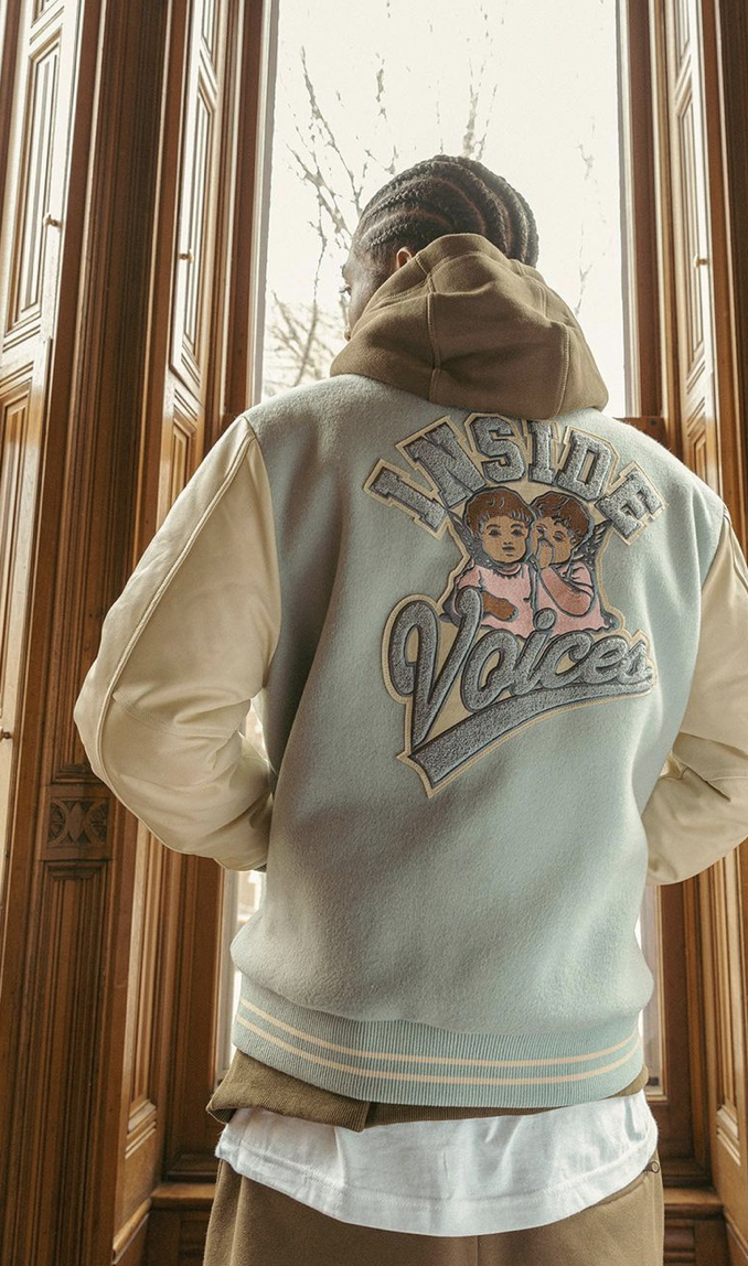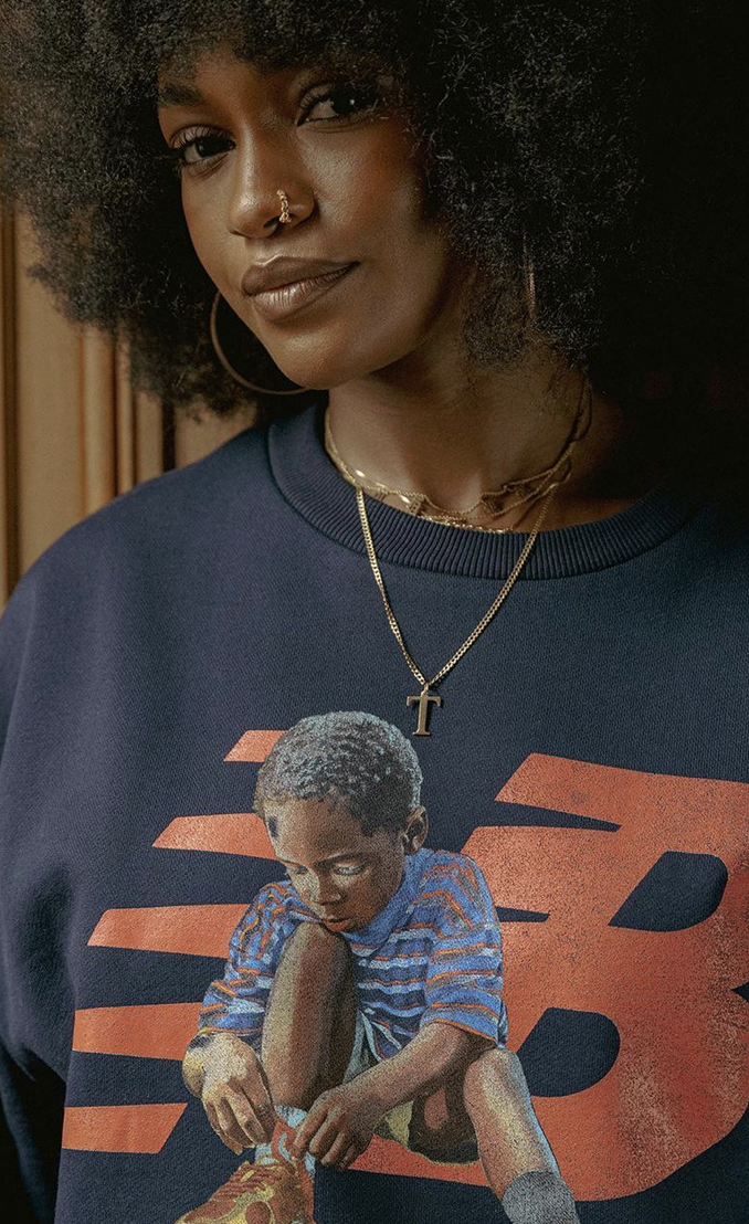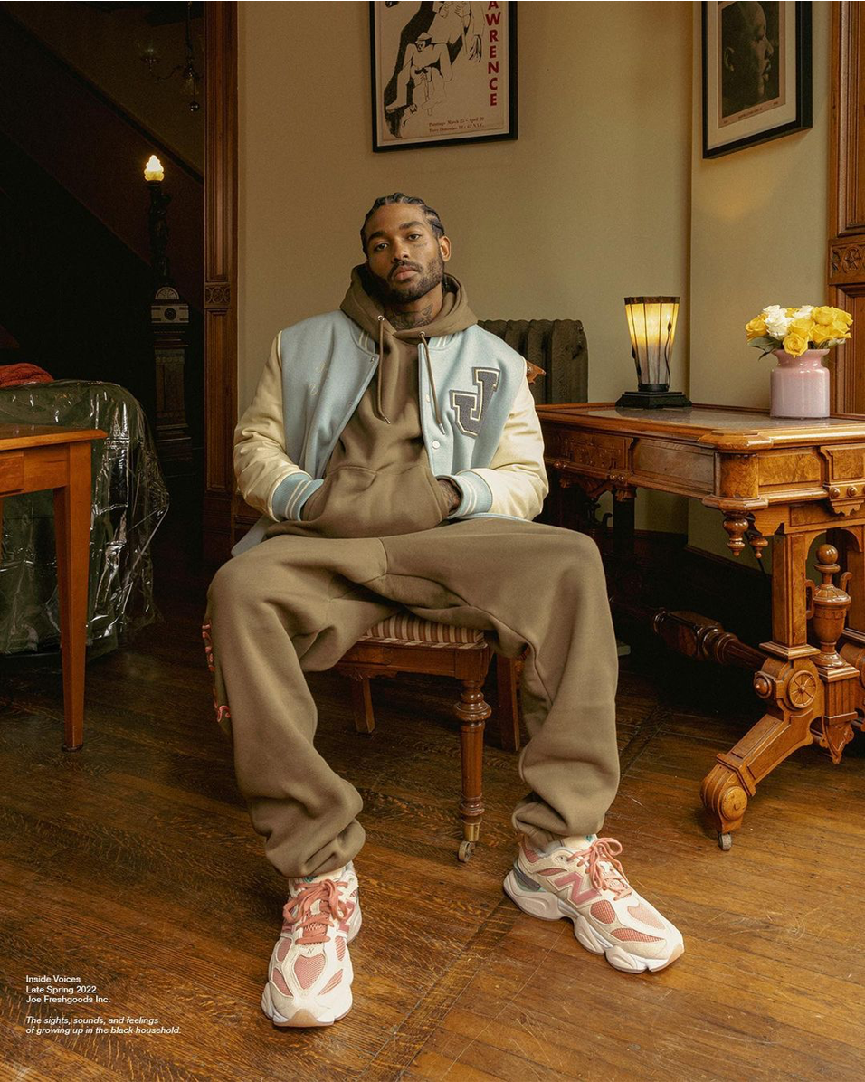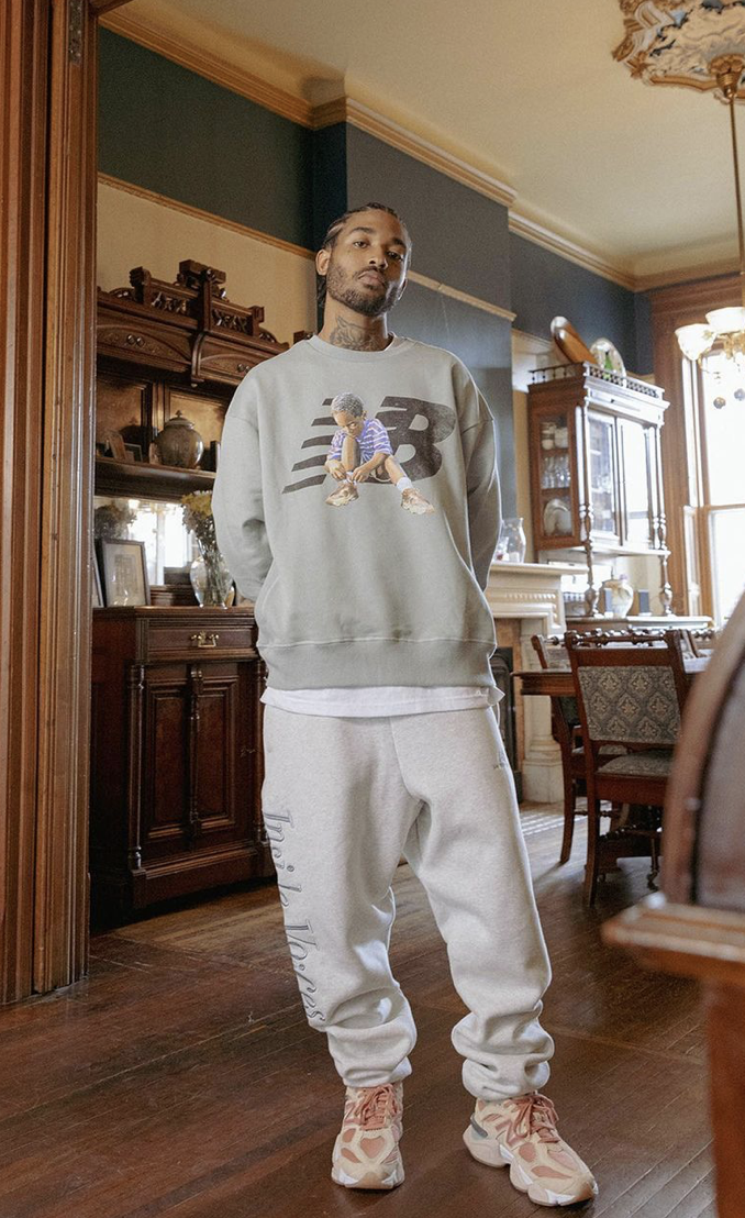 Pour sa collection « Inside Voices », les pièces s’allient parfaitement avec les coloris des 9060. Joe Freshgoods nous propose des varsity jackets, vestes, hoodies ou encore des joggings avec de nombreuses broderies et imprimés. Les initiales New Balance s’imposent sur les crewnecks gris et bleu marine où l’on voit un enfant mettant sa paire de 9060.