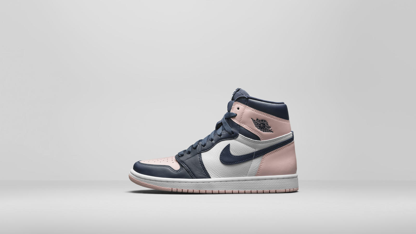 Commençons avec la Air Jordan 1 High OG WMNS Atmosphere. Inspirée par les différentes teintes roses des chewing-gums, cette paire a été conçue en nubuck et en cuir, on pourra également apercevoir un chewing-gum écrasé imprimé sur la semelle extérieure de la paire.