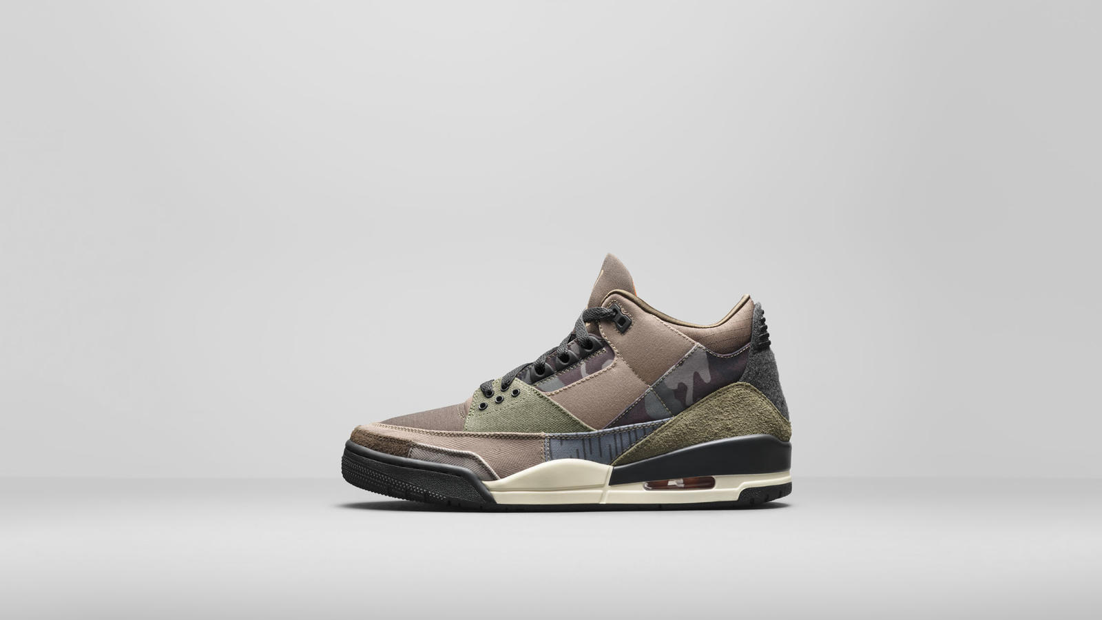 Cette seconde Air Jordan 3 au coloris plus originale nommé Camo fera également son arrivée dans les prochains mois. On retrouve plusieurs empiècements en twill, canvas, ripstop et en chevrons sur lesquels sont imprimés des camouflages pluie, feuilles et forêt. La paire dispose aussi de patchs interchangeables à mettre au talon.