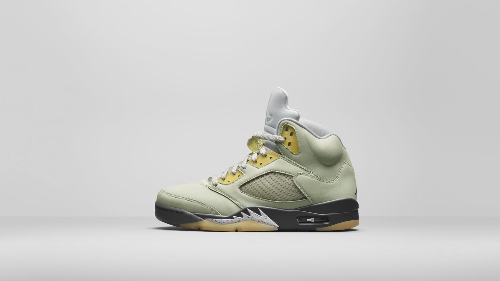 La Air Jordan 5 Jade Horizon arbore un cuir premium accompagné d’une outsole translucide jaunie ainsi que d’oeillets de la même couleur. On aperçoit aussi une midsole noire et une languette réfléchissante.