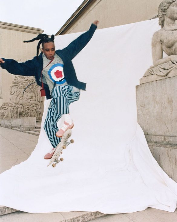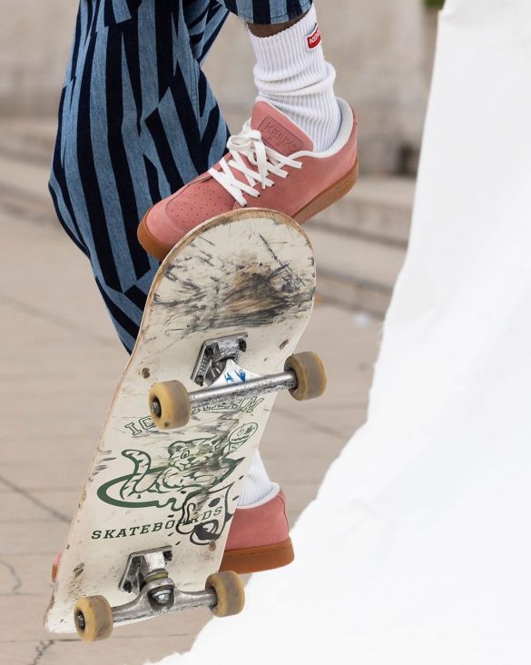 Celle-ci s’inspire des skate shoes des années 90, la fat tongue ainsi que la semelle plate sont bien présentes. L’inspiration va jusqu’au nom « Dome » tiré d’un des spots de skate les plus mythique de Paris situé au Palais de Tokyo. C’est ici que la sneakers se dévoile, participant à des tricks réalisés par des skateurs locaux.