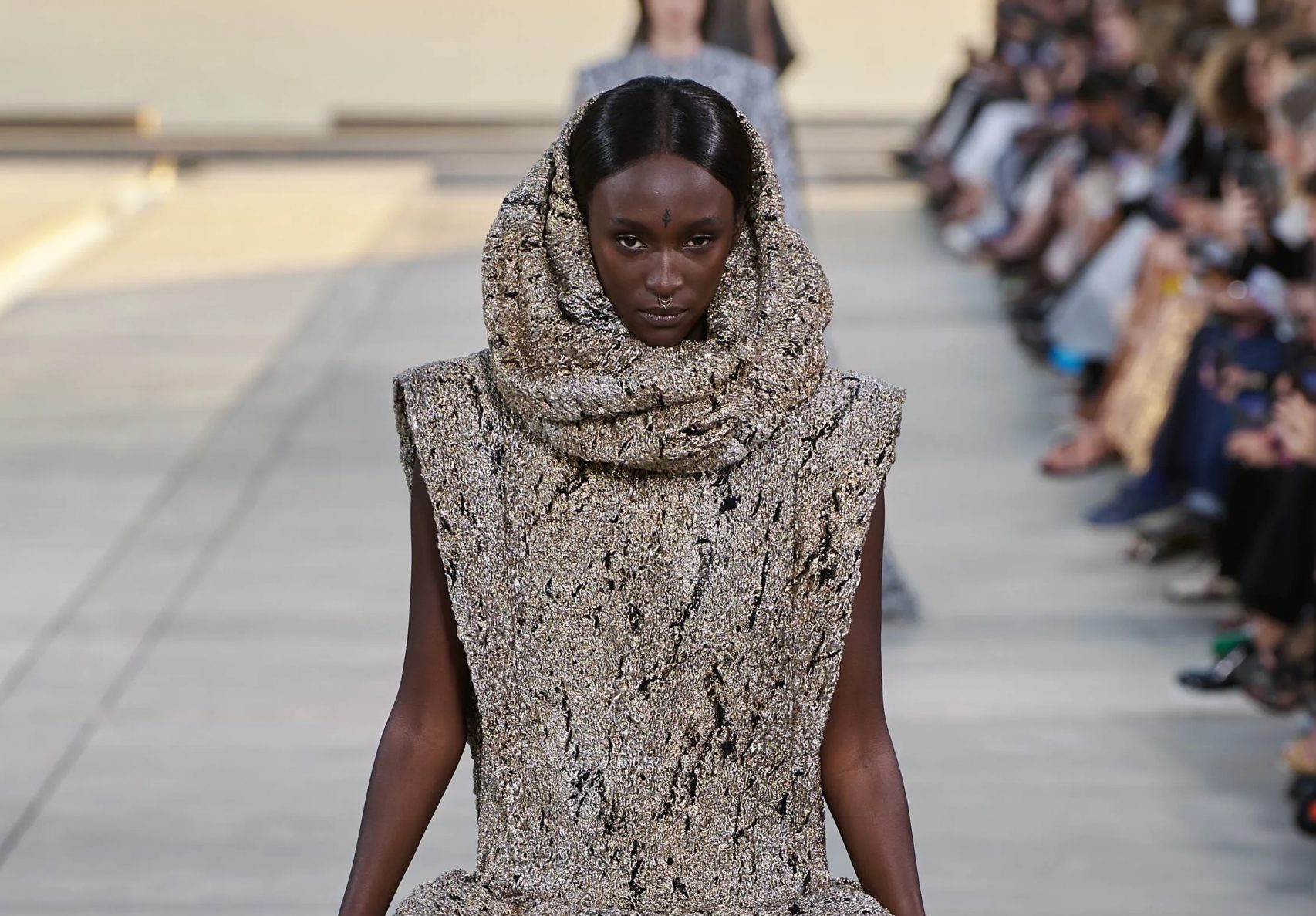 Véritable invité à part entière, le soleil a fait jouer les éléments sur le défilé. Ghesquière a choisi des tissus métalliques et des ornements qui reflétaient le soleil couchant, et d’autres matériaux qui permettaient de s’en protéger, en enveloppant de longues bandes de lin, par exemple, autour de la tête et sur le corps.