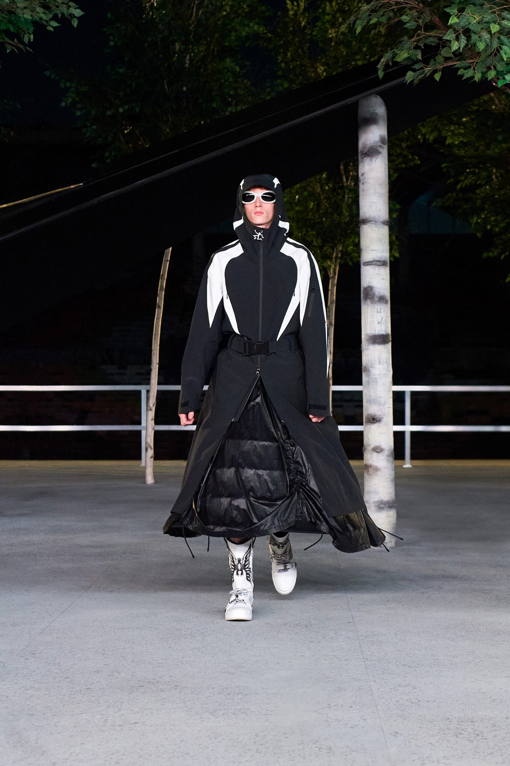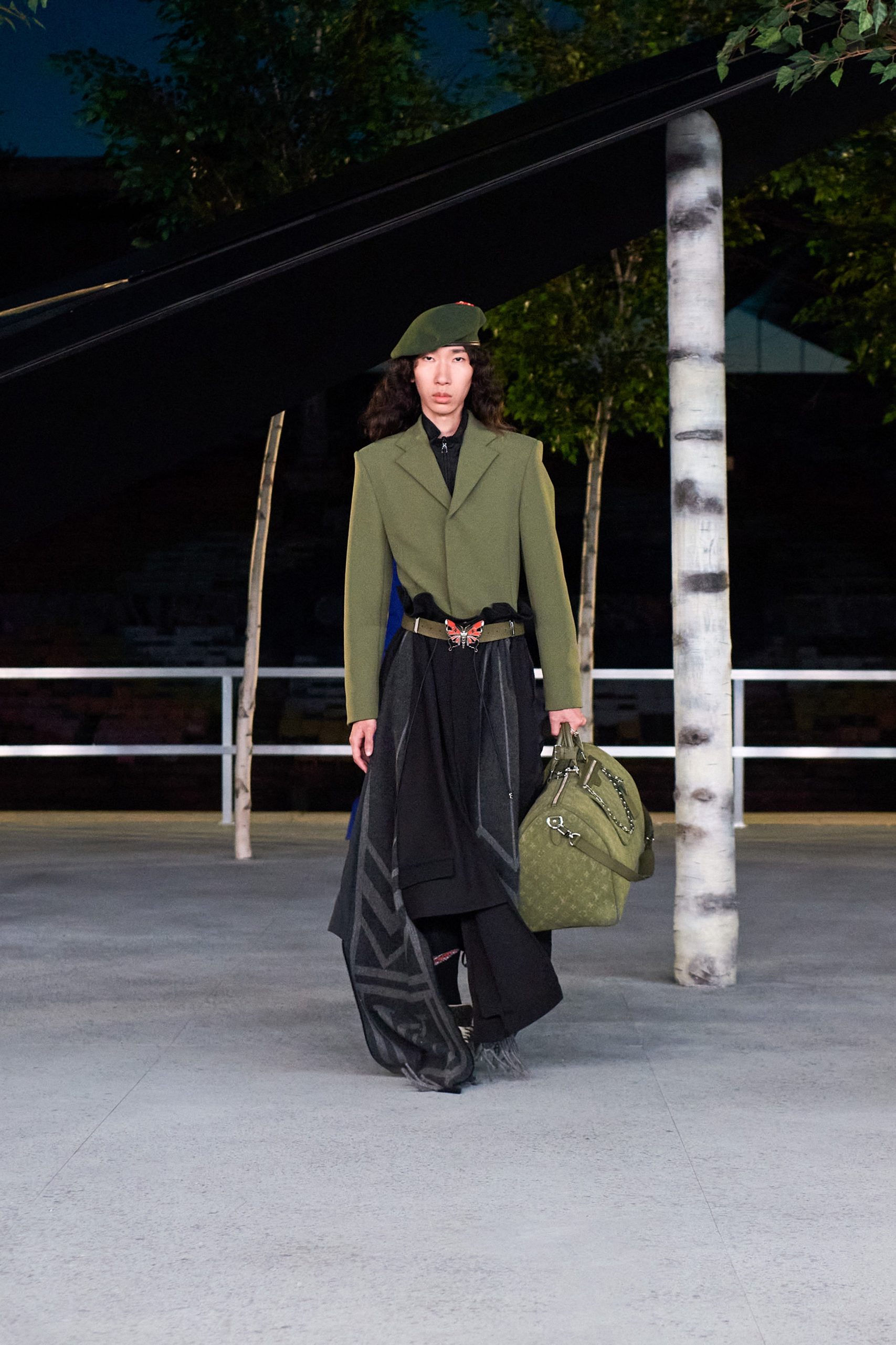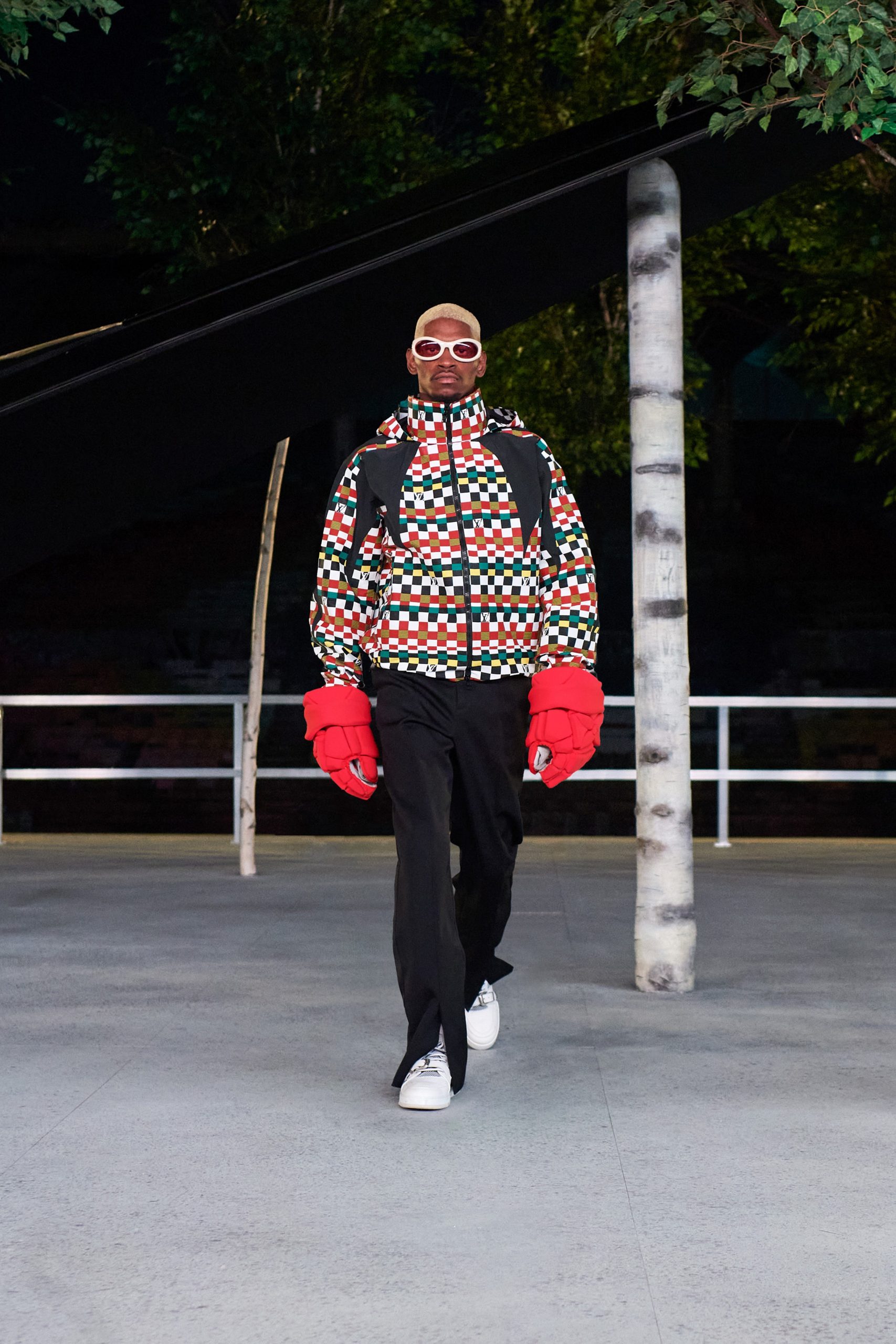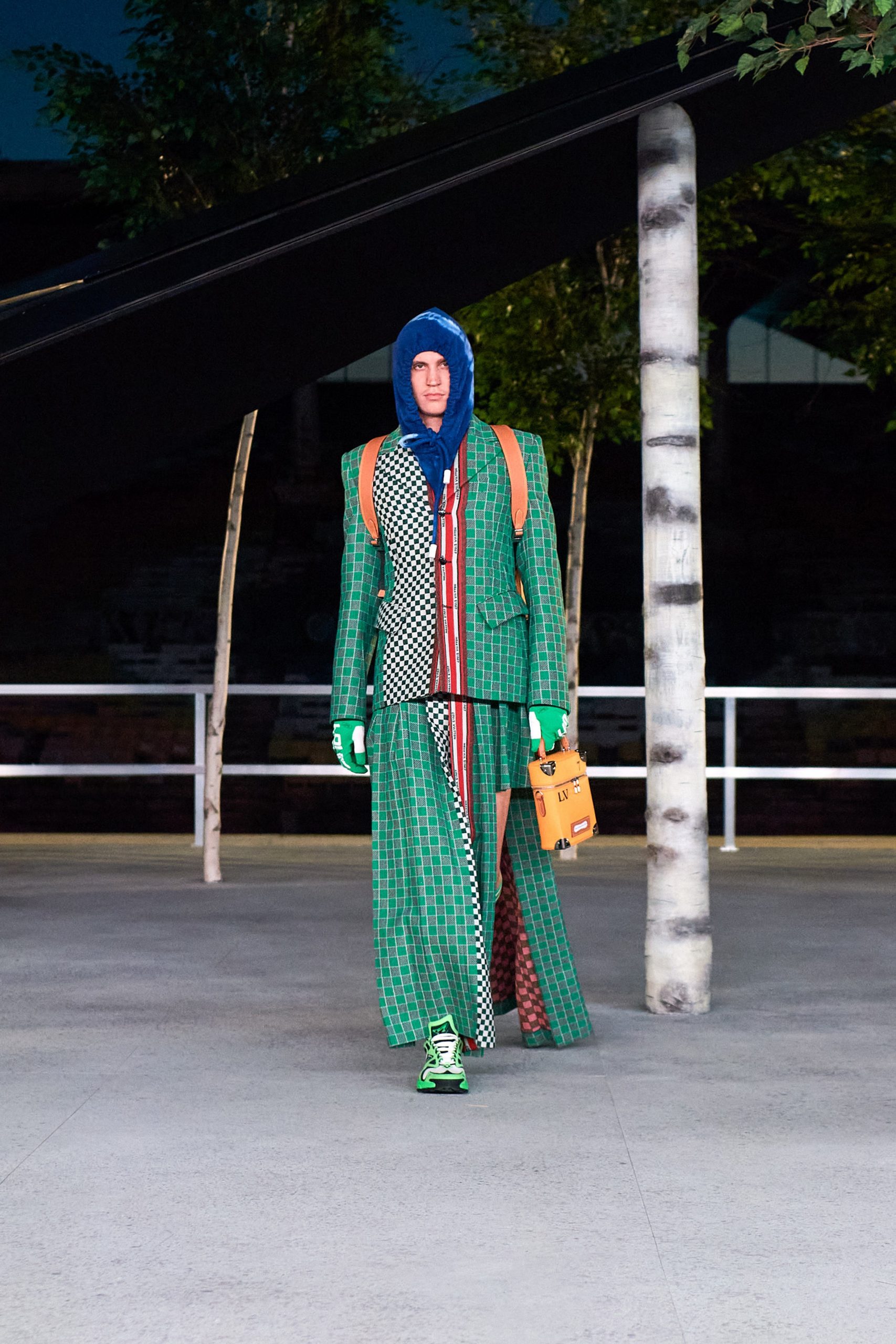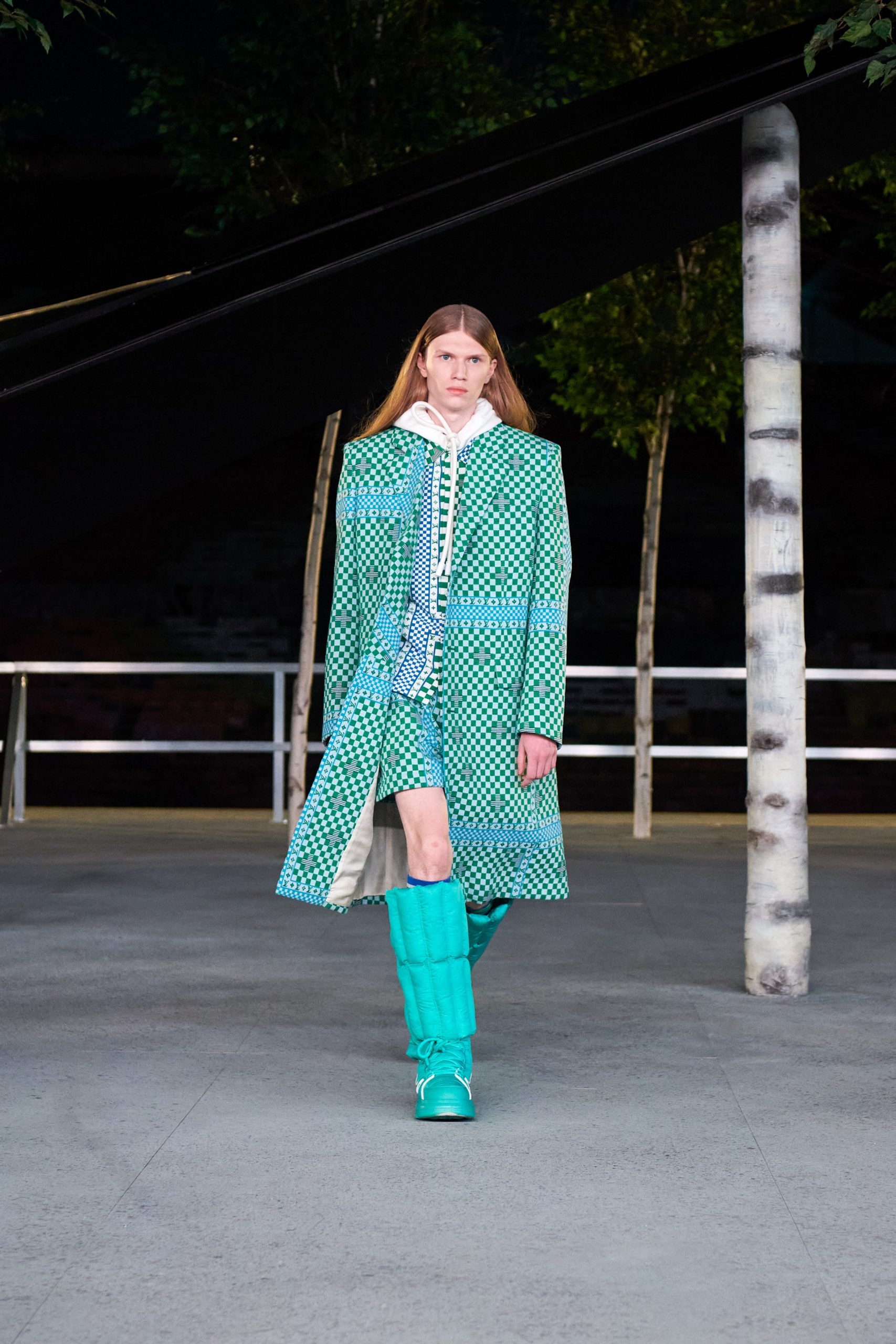 Avec une forte présence du motif damier justifiant le jeu des échecs comme principale inspiration, la collection reflète le conflit entre deux esprits uniques, de manière stratégique. Alors, on admire les gilets de costume et pulls mêlés aux jupes, à la sauce kendo, dans une volonté de casser le vêtement genré. Et qui de mieux que Kid Cudi pour aider à cette tâche? L’ami vient boucler la boucle, lui qui paradait déjà au premier show du chicagoan chez Louis Vuitton.