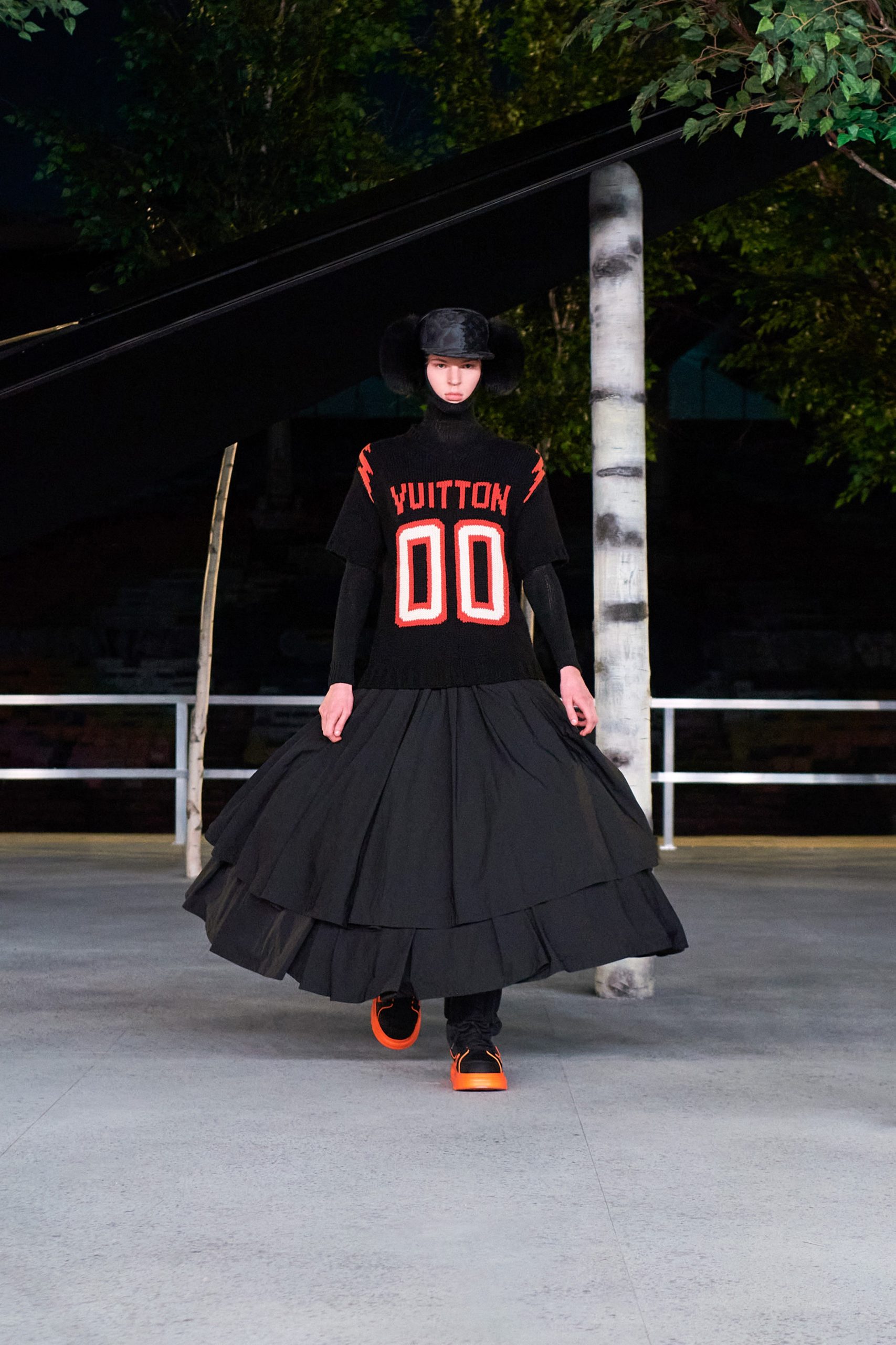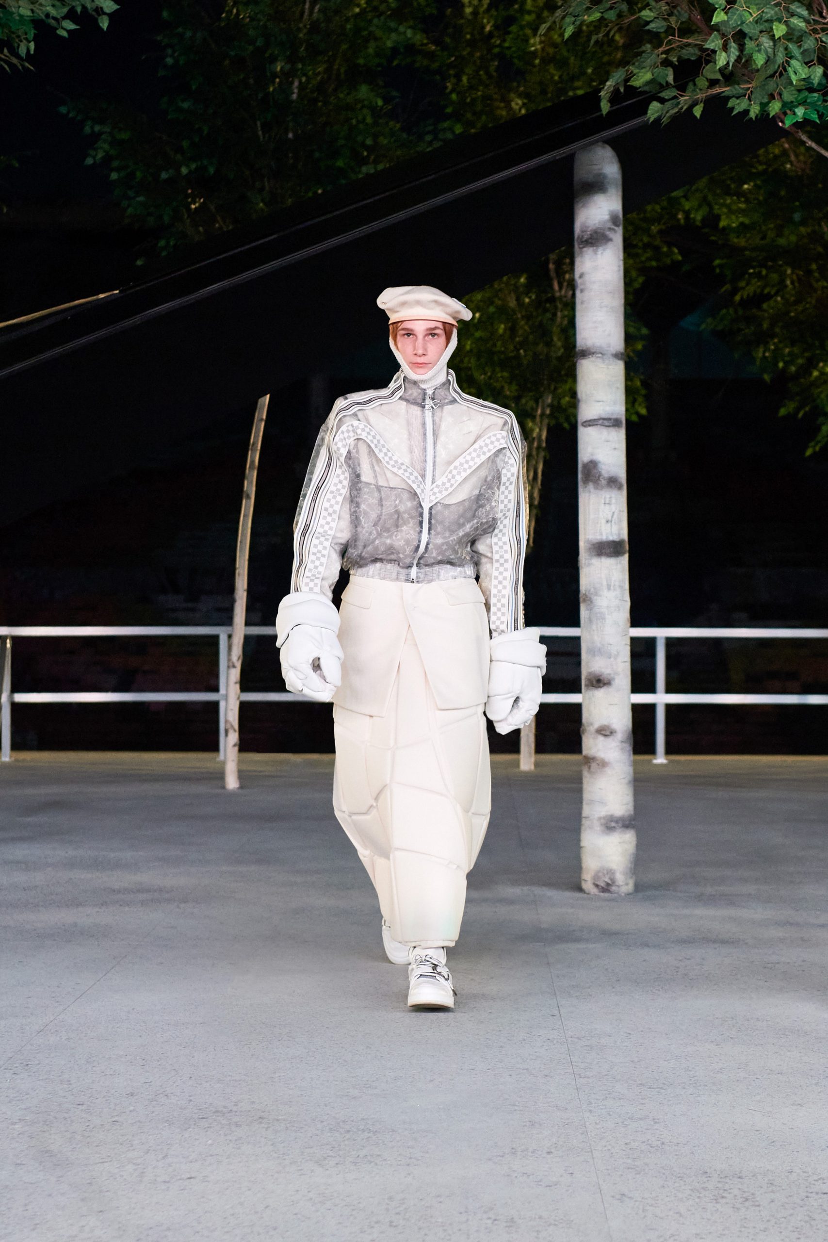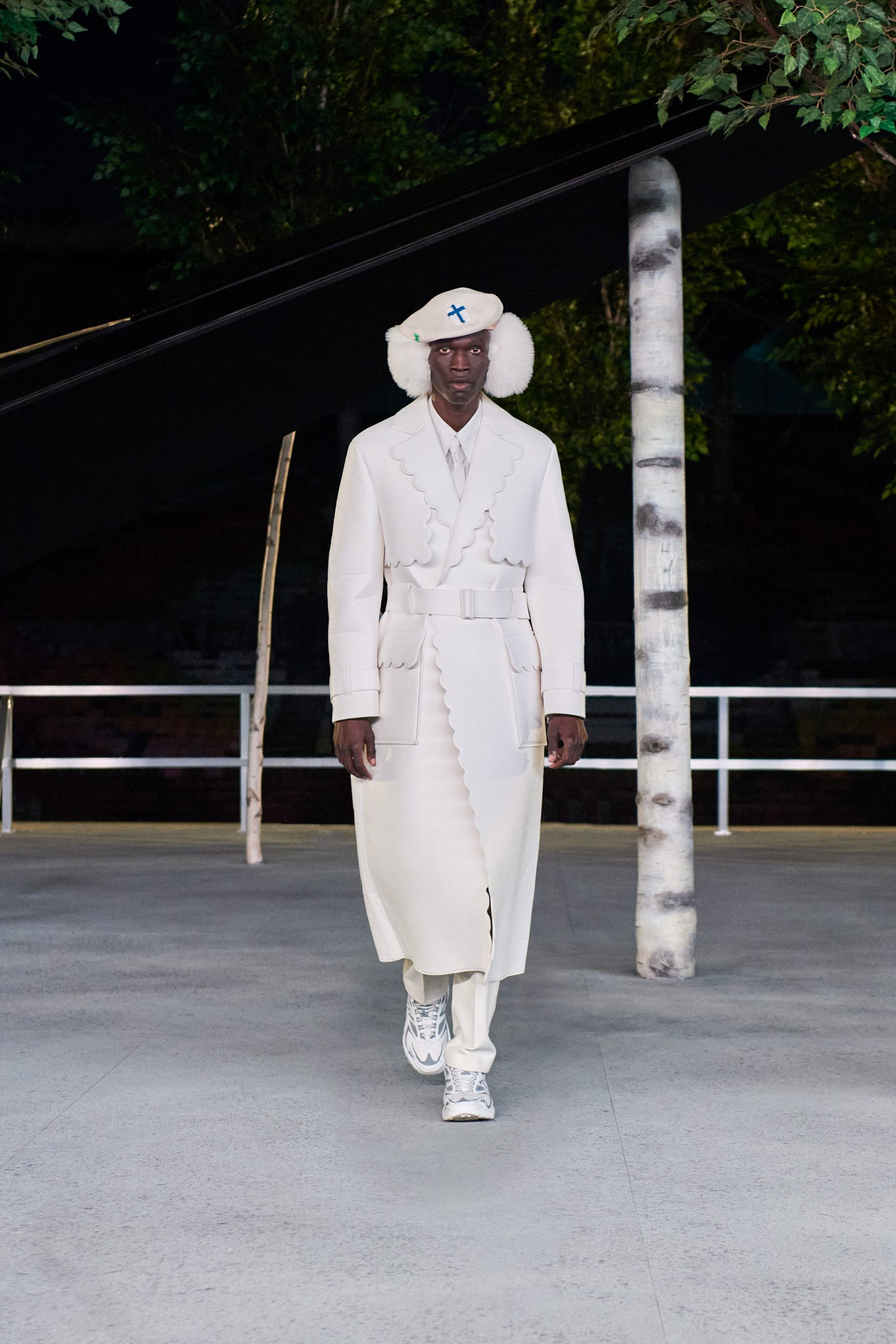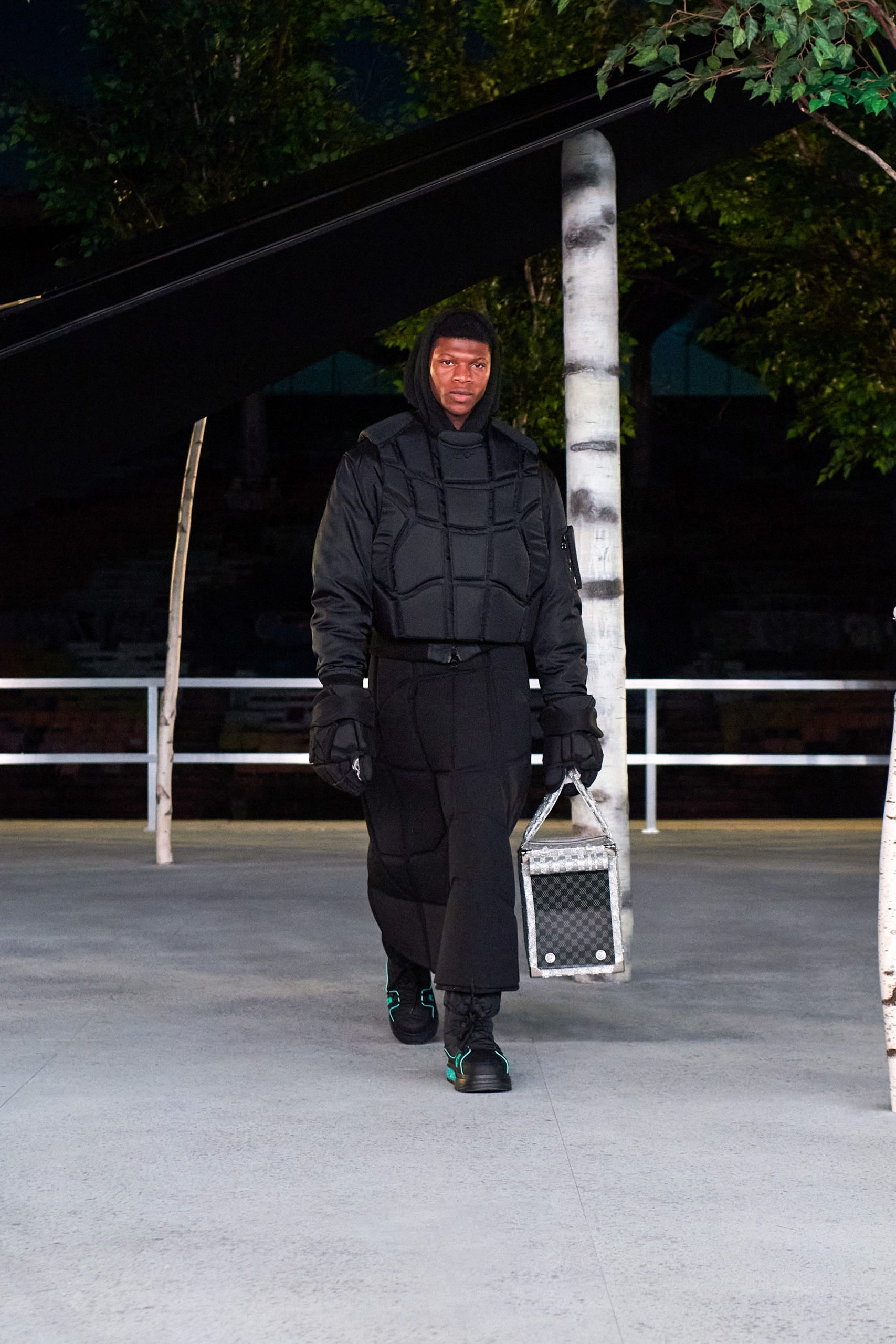 Les pièces bien taillées sont contrastées par l’énormité des gants type « main de Hulk », des vestes types « pare-balle » et autres cache-oreilles à fourrure. Enfin, aux Air-Force tant attendues sont venues s’ajouter les LV Trainer en mode santiag. La diversité de la tête, jusqu’au bout des jambes. Ce dernier hommage aura été supporté entre autres par les amis du créateur qui auront défilé, comme Quavo, Offset et A$AP Nast.