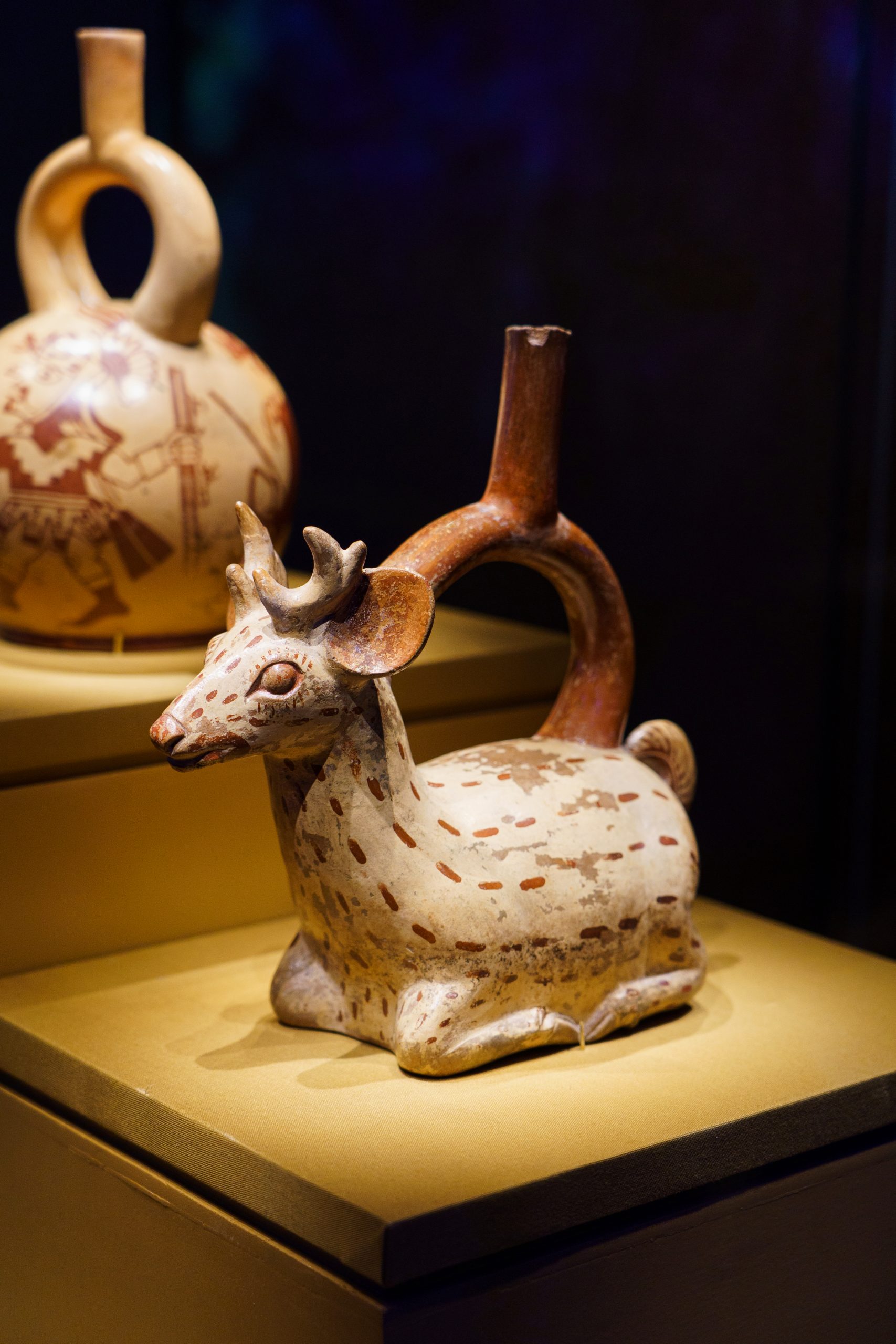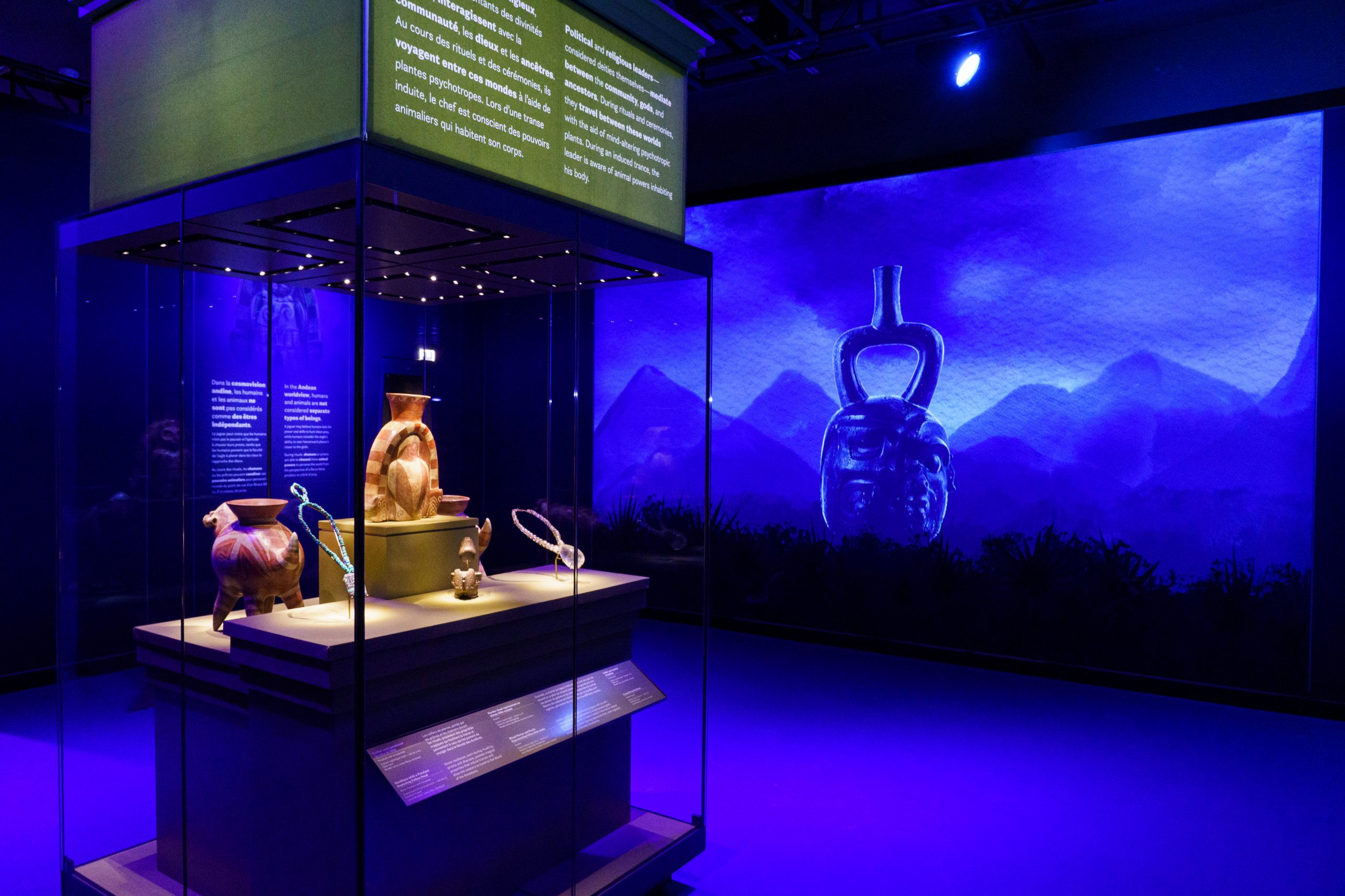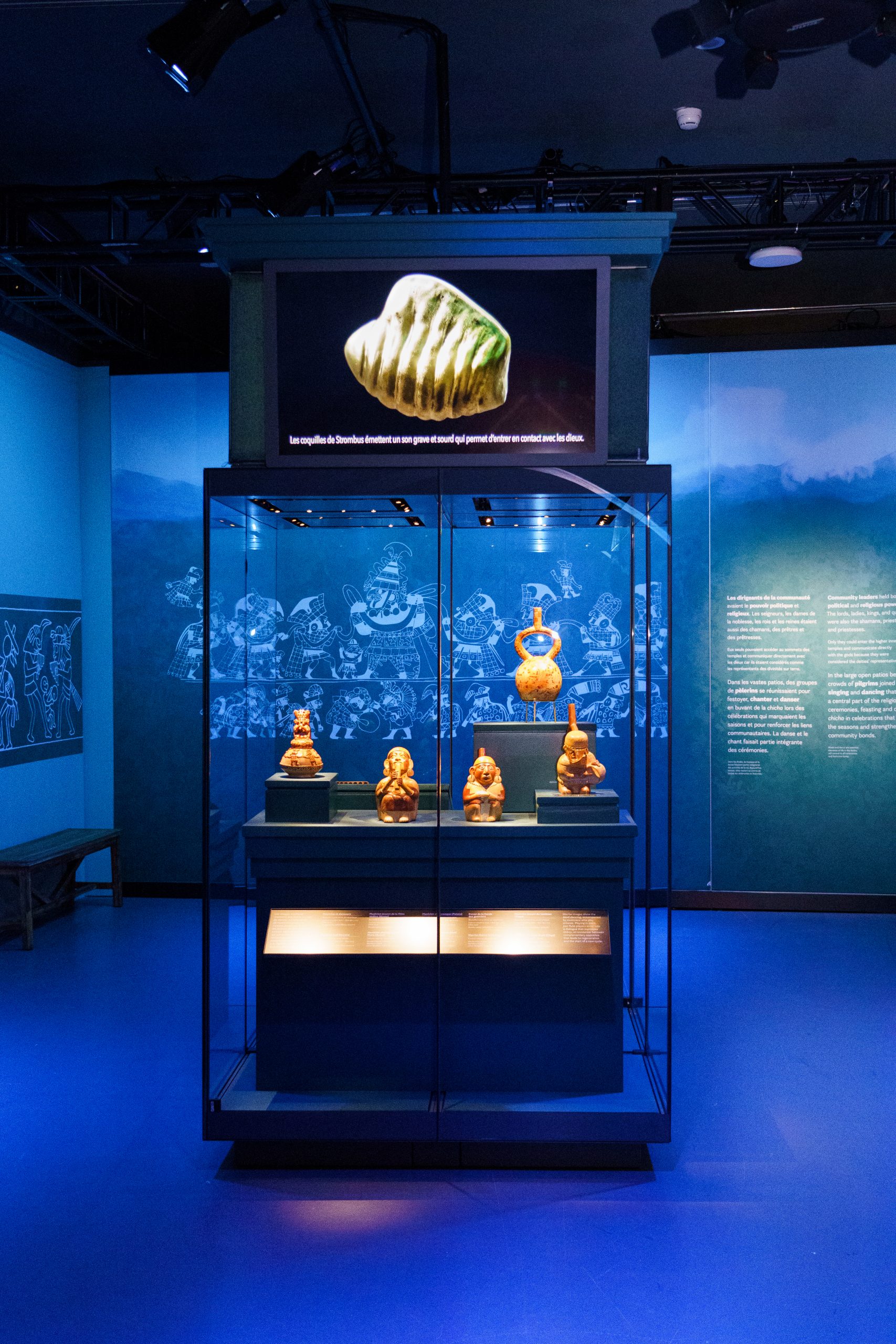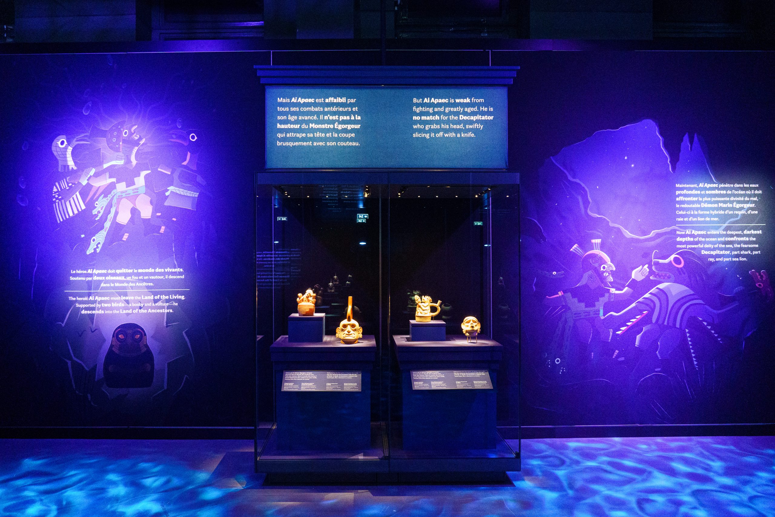 Avec son jeu de lumières immersif, ses écrans pour illustrer les rituels de l’époque et ses très nombreux vestiges archéologiques, l’exposition longue d’une heure environ nous fait traverser l’histoire ancienne de la cordillère des andes. Et au coeur de cette histoire se cache Ai Apaec, un personnage mythologique que l’on découvre au fil des salles. Il fut l’une des divinités les plus importantes de la région.