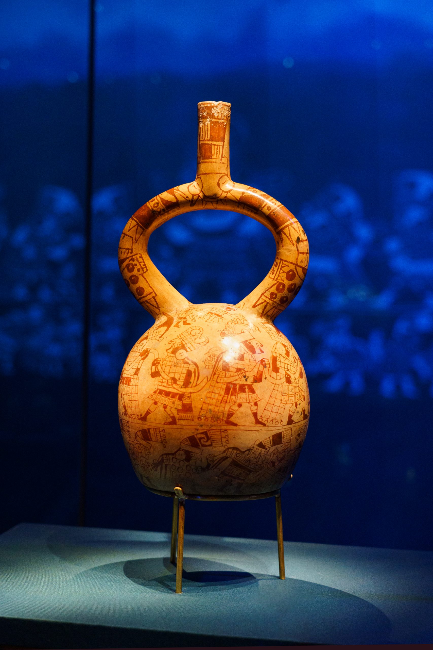 Détail d’une cruche en céramique à bord évasé illustrant les épisodes de l’épopée mythologique d’Ai Apaec. (100 – 800 apr. J.-C.)