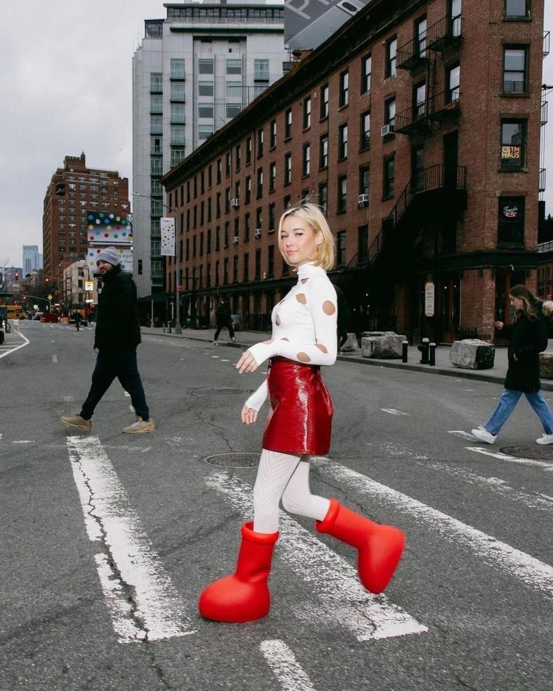 Entièrement faite de TPU rouge, on retrouve également le branding du label sur la semelle de la chaussure. La paire de botte est alors baptisée par le studio MSCHF « Big Red Boot ». Pour la campagne, le collectif artistique fait appel à la It-girl Sarah Snyder, photographiée par le célèbre photographe Garrett Bruce. Sarah Snyder dévoile ces iconiques bottes rouges en marchant dans les fameuses rues de Brooklyn et en faisant ses courses dans une épicerie typiquement américaine.