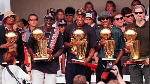 Les Bulls de Chicago ouvrent ce podium avec 6 victoires de Playoffs réalisées en deux three peat (trois victoires des Playoffs d’affilée). La première série de victoires fut réalisée en 1991-1992-1993 avec le duo Pippen & Jordan et la seconde en 1996-1997-1998 avec l’énorme trio Jordan, Pippen et Rodman. Michael Jordan et Scottie Pippen. Ces derniers ont contribué à toutes les victoires des Chicago Bulls.
