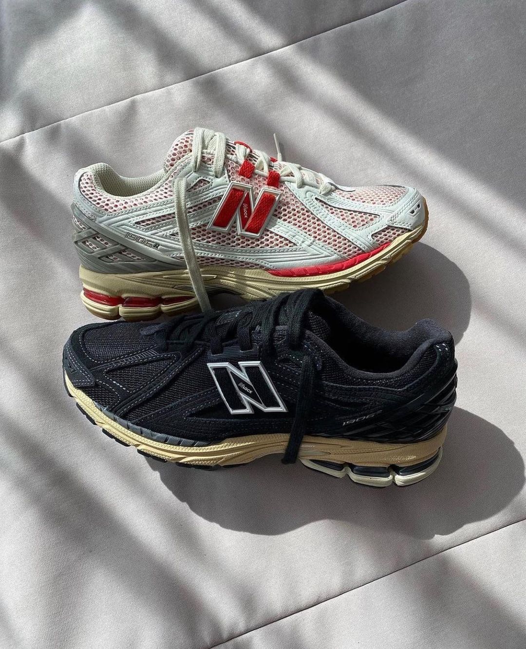 À travers cette nouvelle collaboration Thisisneverthat fait un bond dans le passé. Les paires présentent un aspect rétro année 2000 avec leur semelle jaunie et leurs superpositions en mesh gris. La première déclinaison rouge et grise peut rappeler les paires d’Asics en collaboration avec Kiko. La seconde elle, présente un look plus épuré avec son upper en suede noir. Les deux modèles disposent du laçage Nlock ainsi que des technologies ABZORB et N-ERGY.