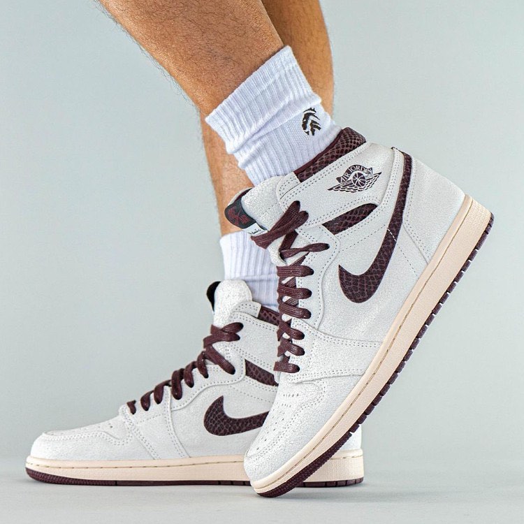 Les deux entités travaillent ici, sur un autre classique Jordan : la Nike Air Jordan 1. À l’image de sa grande sœur, la paire reprend un design simple et épuré avec des matériaux premium. On retrouve une empeigne en Suède gris/blanc cassé agrémentée d’un swoosh bordeaux avec un effet snakeskin. Les lacets ainsi que la languette et le logo Wings, sont dans le même effet bordeaux en snakeskin. La languette tout comme la semelle intérieure présente un co-branding Nike x A Ma Maniere.  Le tout est sublimé par une semelle jaunie donnant un côté usé et vintage du plus bel effet. Une tendance en vogue cette année. Ce même procédé sera d’ailleurs présent sur les prochaines Air Jordan 2 Low en collaboration avec le designer Virgil Abloh. Comme pour la collaboration précédente, on retrouvera une spéciale box et des lacets supplémentaires pour accompagner la paire.
