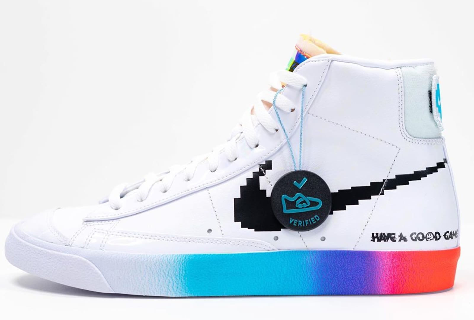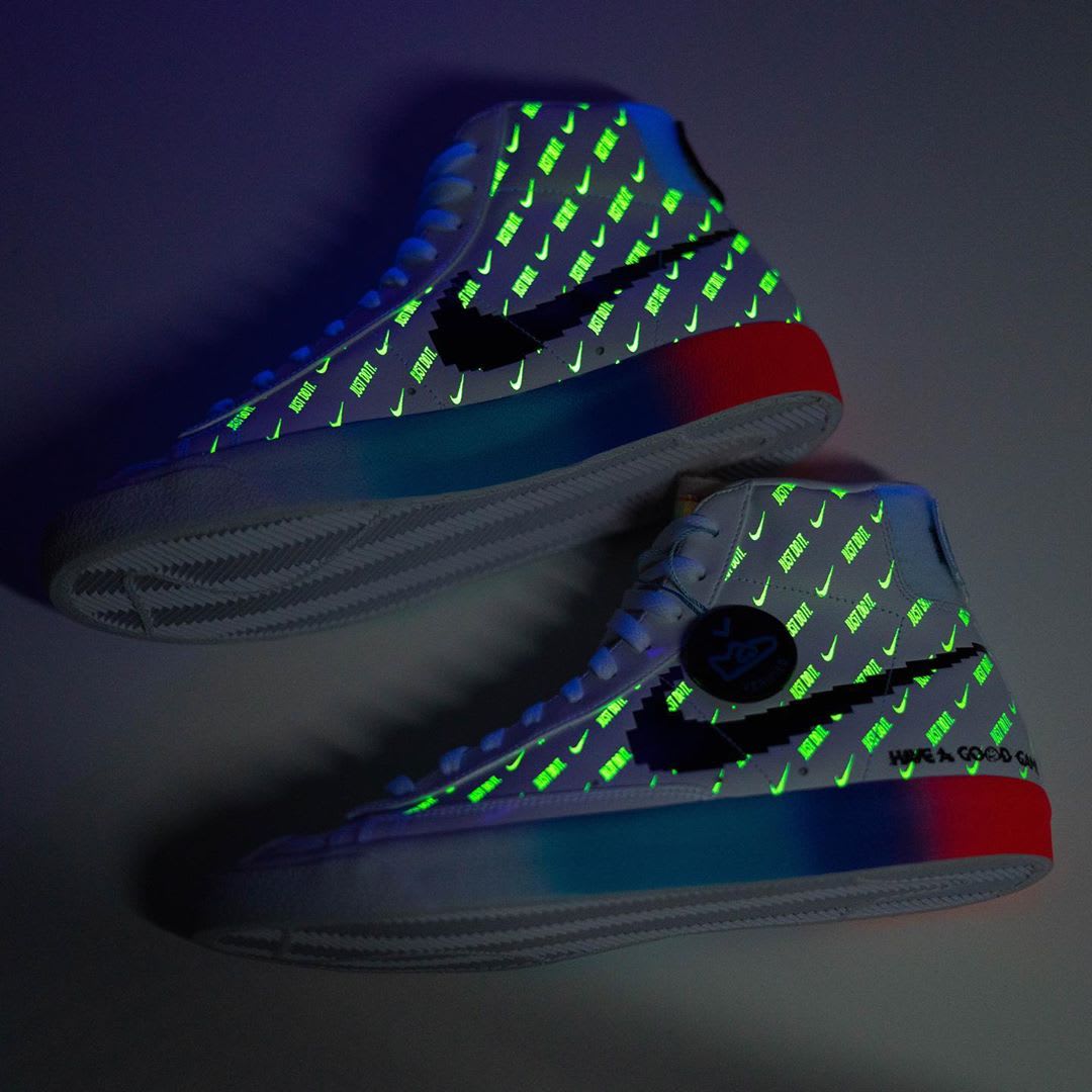 Après la Air Max 97 aux couleurs de la Nintendo 64 et les deux Air Force 1 Low Playstation en collaboration avec Sony, Nike prévoit cette année un nouveau modèle rappelant l’univers du gaming avec cette Nike Blazer Mid ’77 Vintage Have A Good Game. La paire est habillée d’une base en cuir blanc avec un Swoosh noir pixelisé et l’inscription Have A Good Game au talon. On distingue également des éléments en cuir vernis sur la toe box. Des détails multicolores turquoise/bleu/rose/rouge/orange sur la languette et la midsole viennent donner un côté plus « rétro » à la paire. Enfin, on remarque une partie en velcro accompagnée de patchs rouges et bleus à l’arrière. Des mini Swoosh ainsi que le slogan « Just Do It » en matière glow in the dark sont aussi présents sur toute la partie en cuir.
