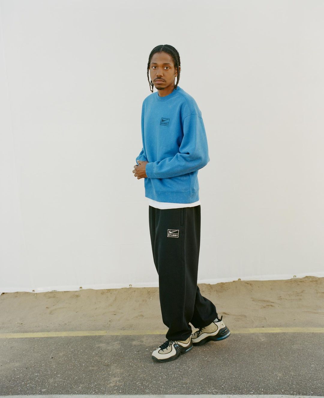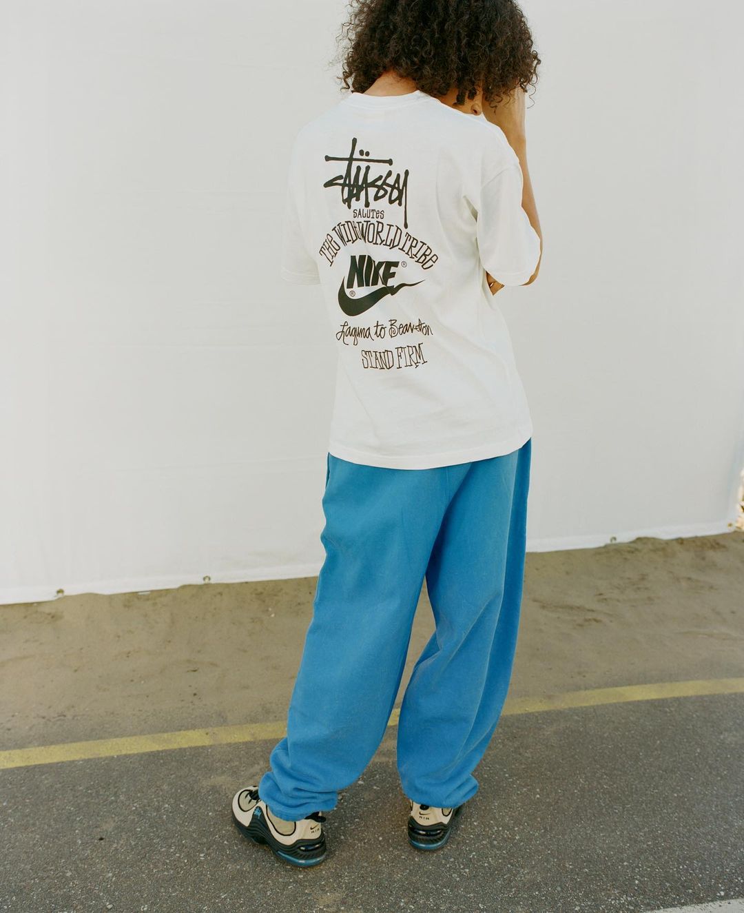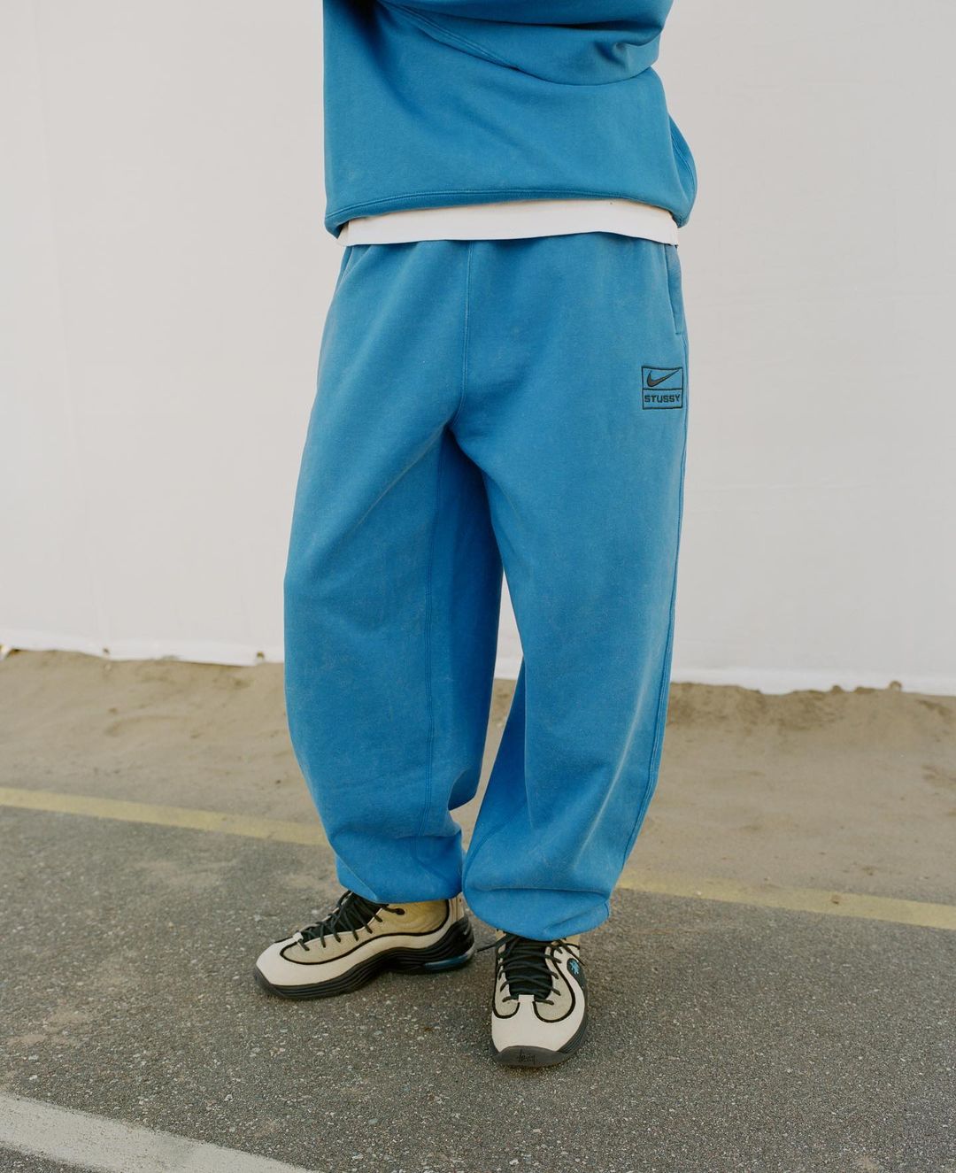 Une collection apparel accompagne la sortie des paires ! On retrouve toujours les pantalons et crewnecks propres à cette collaboration. Et après un colorway rose, l’ensemble se voit aujourd’hui décliné en bleu. Les nombreux logos signature de Shawn Stüssy habillent un t-shirt et un superbe pull en maille. Mais la véritable pièce maîtresse de cette collection c’est l’ensemble sweat à capuche zippé/pantalon arborant un énorme swoosh au dos ainsi que des bandes brandé Stüssy.