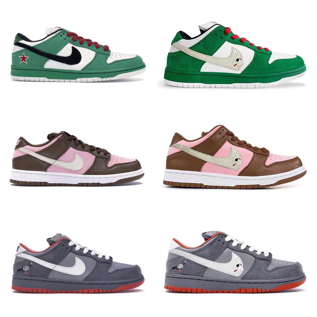 L’histoire commence fin juillet 2020, lorsque Warren Lotas poste sur son compte Instagram, la photo d’une sneaker. Cette silhouette, on la connait tous : il s’agit de la très populaire Nike Dunk Low. À une différence près ! En effet, elle rend hommage aux quarante années du classique slasher Vendredi 13, et propose un motif du mythique masque de hockey, porté par le personnage Jason Voorhees dans le film, au bout du swoosh. Ce coloris « TOXIC GREEN » propose une base en cuir blanc, accompagnée de suède vert. Le swoosh quant à lui, est crème avec les petits détails du fameux masque, à savoir les trous et couleurs. Cette paire est donc très inspirée de la bien connue Nike Dunk Low Heineken datant de 2003 qu’on vous présente ci dessous.