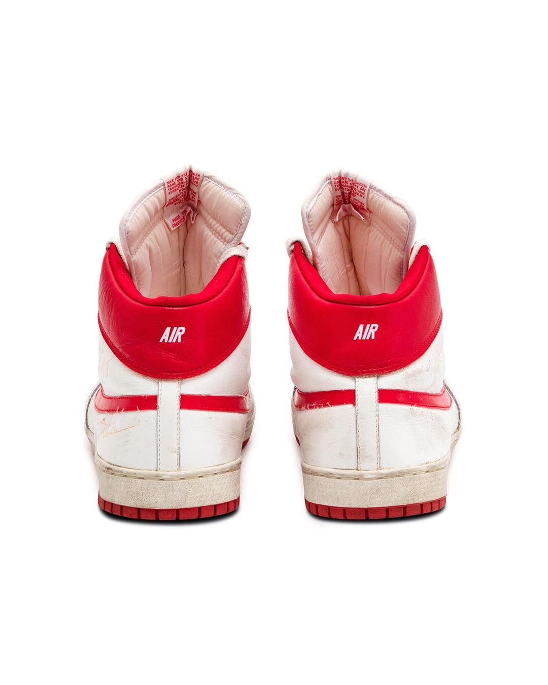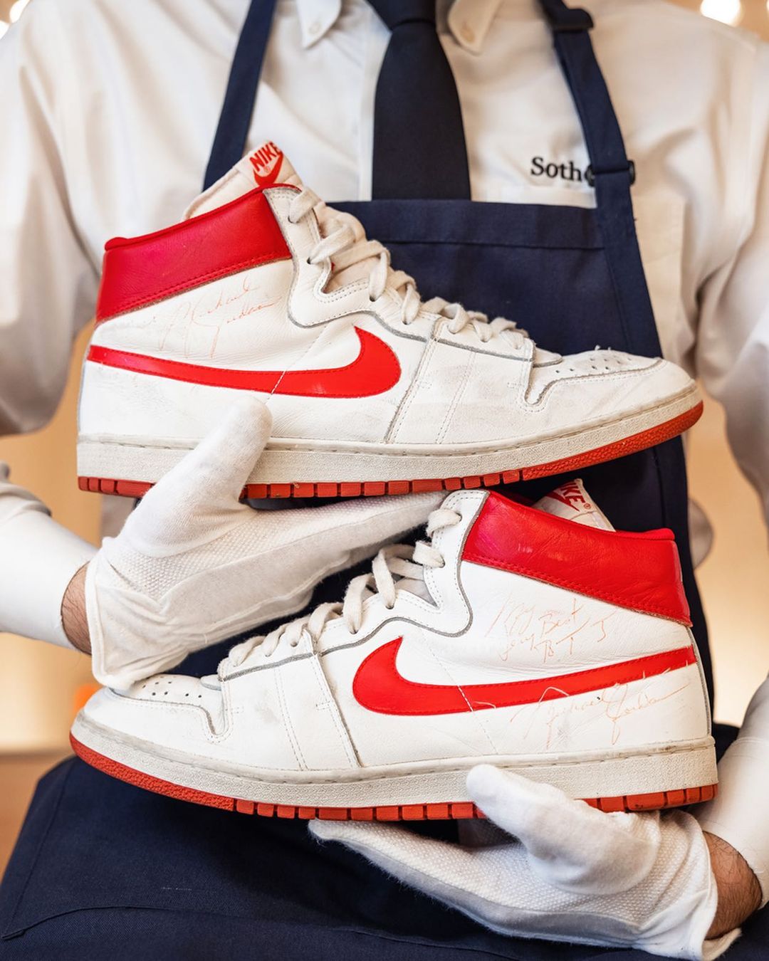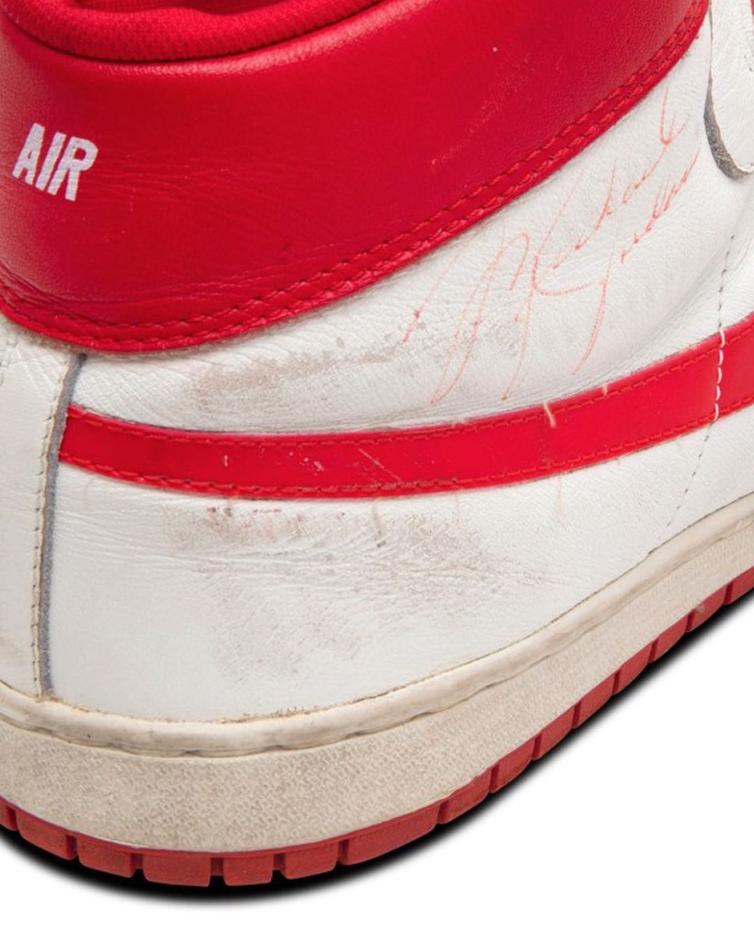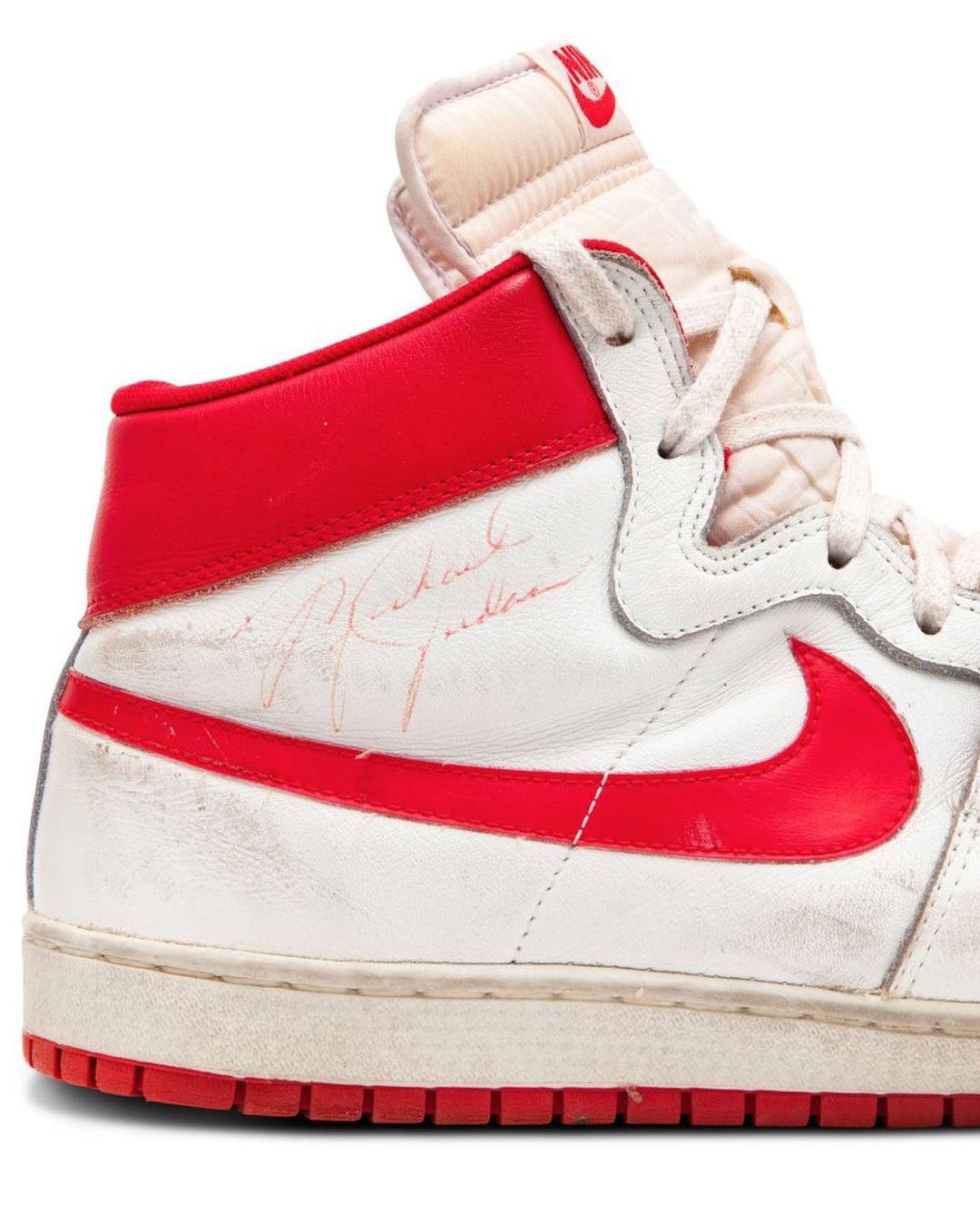 La paire présentée aux enchères, est donc une Nike Air Ship portée par le basketteur lors de sa première saison avec les Chicago Bulls. Plus précisément lors de son cinquième match dans la grande ligue, le 1er novembre 1984. C’est ce qui en fait la plus ancienne paire de Nike portée par Jordan à notre connaissance. En plus d’être portée, la paire est signée par la légende de la balle orange. Cette simple paire au colorway « White/Red » est une « Piece of History ». Une paire mythique, rockée par le plus grand basketteur de tous les temps et prologue de ce que deviendra par la suite Jordan Brand.