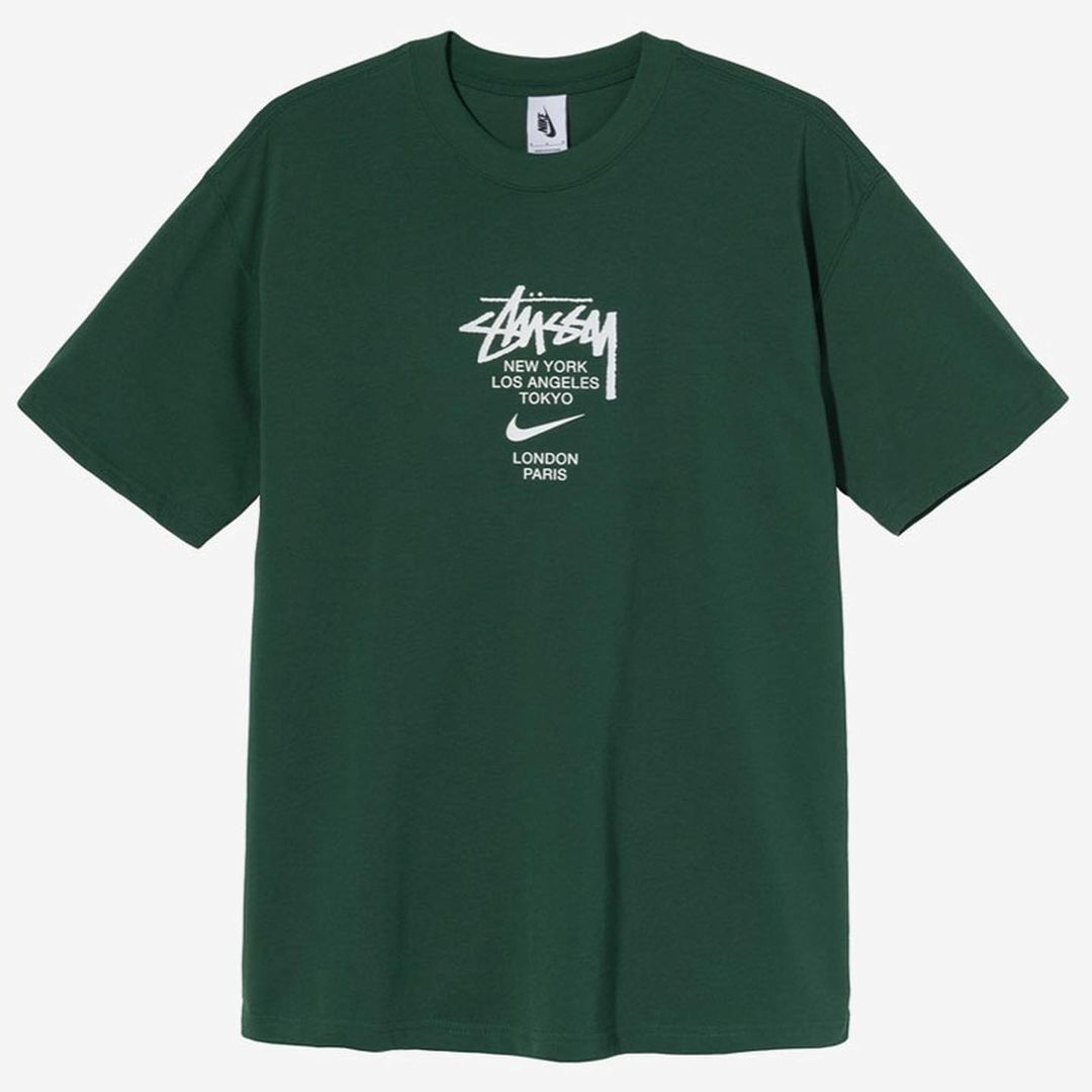 Les deux marques ont aussi communiqué des images officielles de la collection qui accompagnera les deux paires. Allant d’ensembles de survêtements à des bonnets et bobs, en passant par des claquettes Benassi, Stüssy et Nike nous ont sorti de très belles pièces pour clôturer cette année. On retrouve en tête de cette collection textile des tee shirts disponible en 3 coloris (noir, blanc et vert), un pantalon et une jupe rembourrée.