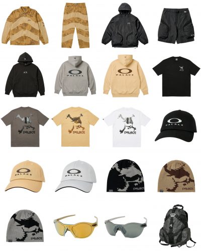 Afin d’accompagner les montures, on retrouve des pièces textiles ornées du logo de la collection. Le logo circulaire d’Oakley voit ici son inscription remplacée par celle de Palace. Au programme : des pièces techniques orientées outdoor dans des tons noirs, gris et ocres. Notre pièce préférée reste l’ensemble veste et short avec des poches bombées semblables à des verres de lunettes. Mais vous pourrez retrouver aussi des vestes et pantalons aux inspirations plus workwear ainsi que des pièces plus simples comme des hoodies toujours dans les mêmes tons ainsi que des t-shirts ornés de têtes de mort. Côté accessoires, retrouvez en plus des deux paires de lunettes, des casquettes, des bonnets ainsi que des sacs à dos techniques.