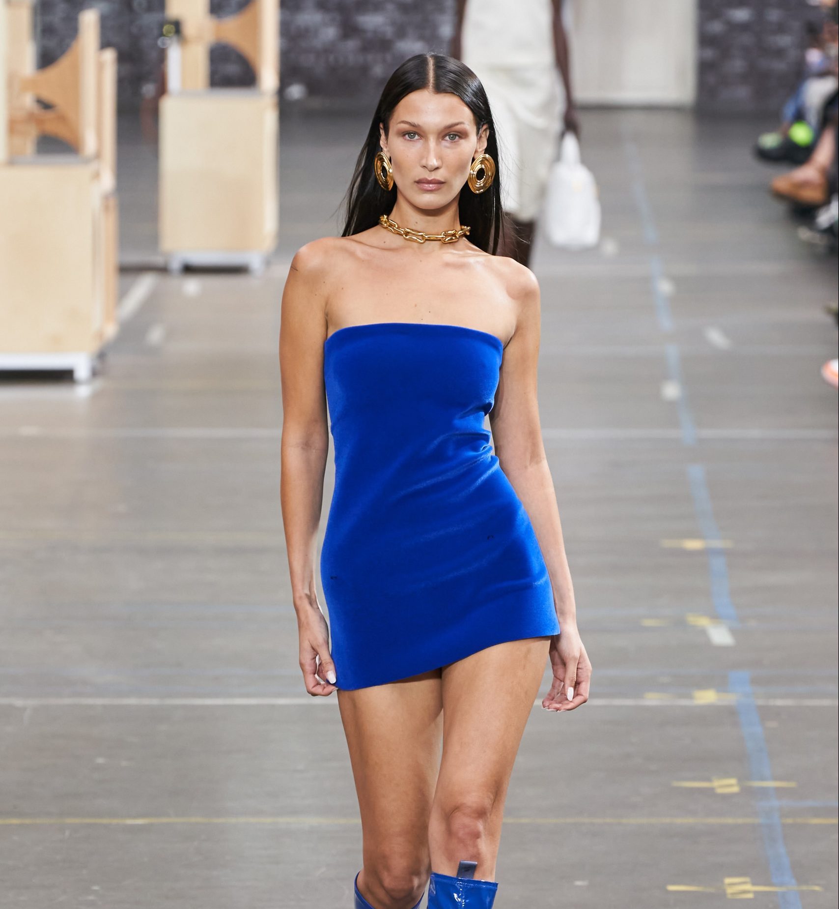 Ainsi, on voit Bella Hadid sublime dans une micro-robe bustier d’un bleu pétant ou encore Joan Smalls, portant une robe tout en relief. Épaules carrées et velours chez les femmes, costumes structurés, doudounes et capuches chez les hommes.