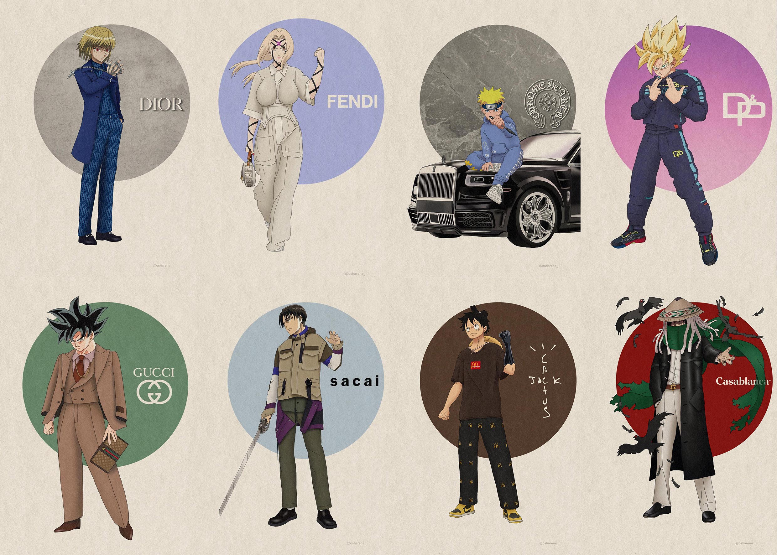 Sangoku vêtu de Dior, ou encore Luffy portant un ensemble Cactus Jack ? C’est ce que propose Osharena. Avis aux fans de manga et de mode : cet artiste est fait pour vous ! TrenteTroisDegrés vous brosse son portrait.