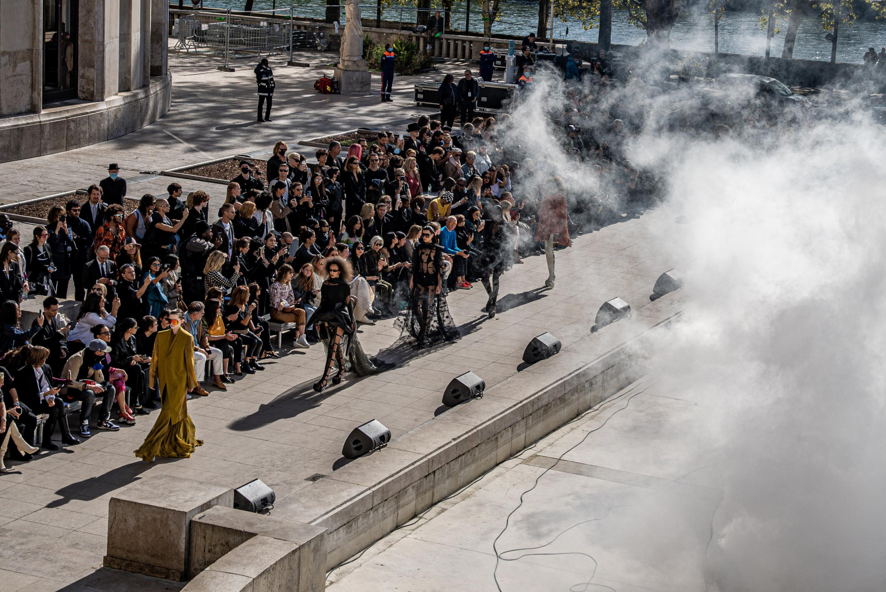 Jeudi, la température était très élevée lors de ce show. Autour de la fontaine du Palais de Tokyo, les mannequins défilent dans une ambiance apocalyptique. Rick Owens réalise ce défilé comme une métaphore du monde perturbé par la pandémie, la guerre ou encore le réchauffement climatique. Les pièces présentées sont inspirées d’un voyage en Égypte où l’on observe des pantalons amples, traînant au sol, du tissu tulle coloré recouvrant les mannequins de la tête aux pieds ainsi que des chemises aux épaules bouffantes. Ce show se déroule sous l’intrigue de 3 sphères prenant feu pour tomber chacune leur tour dans la fontaine.