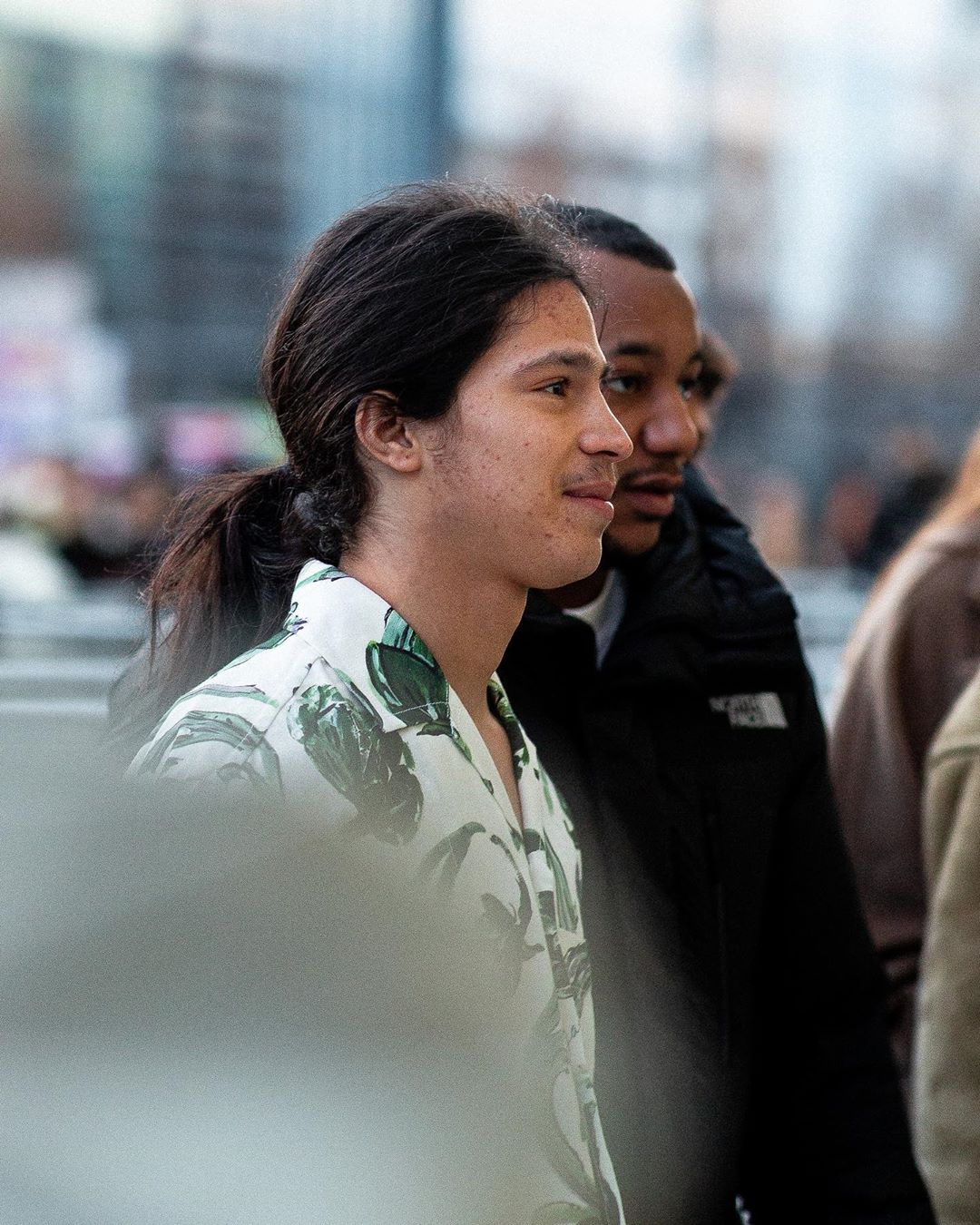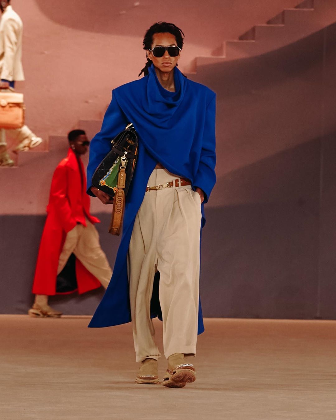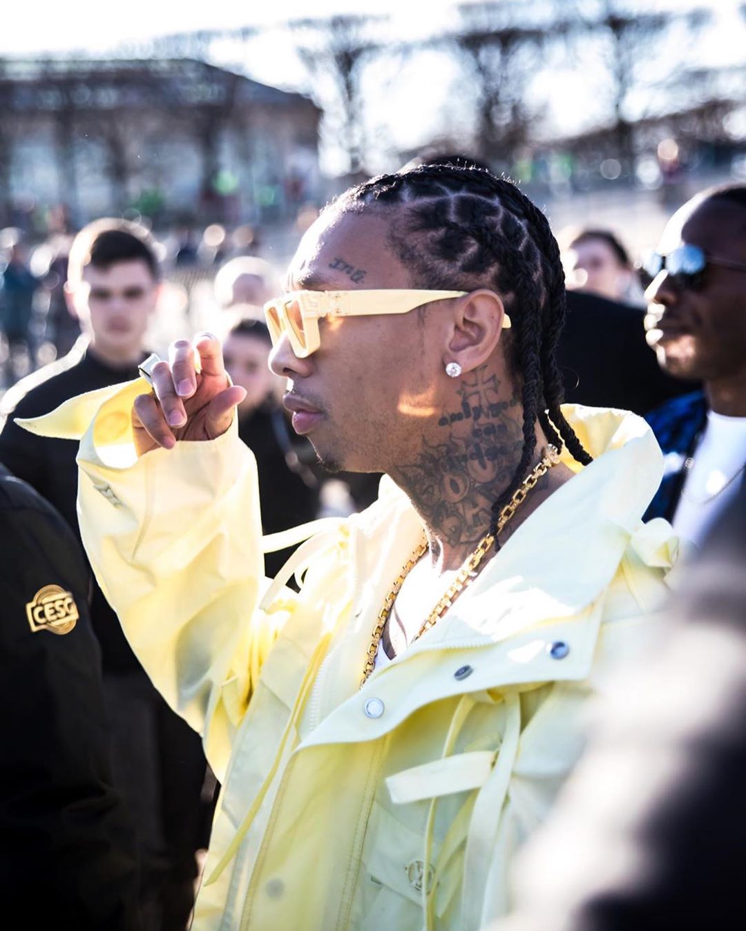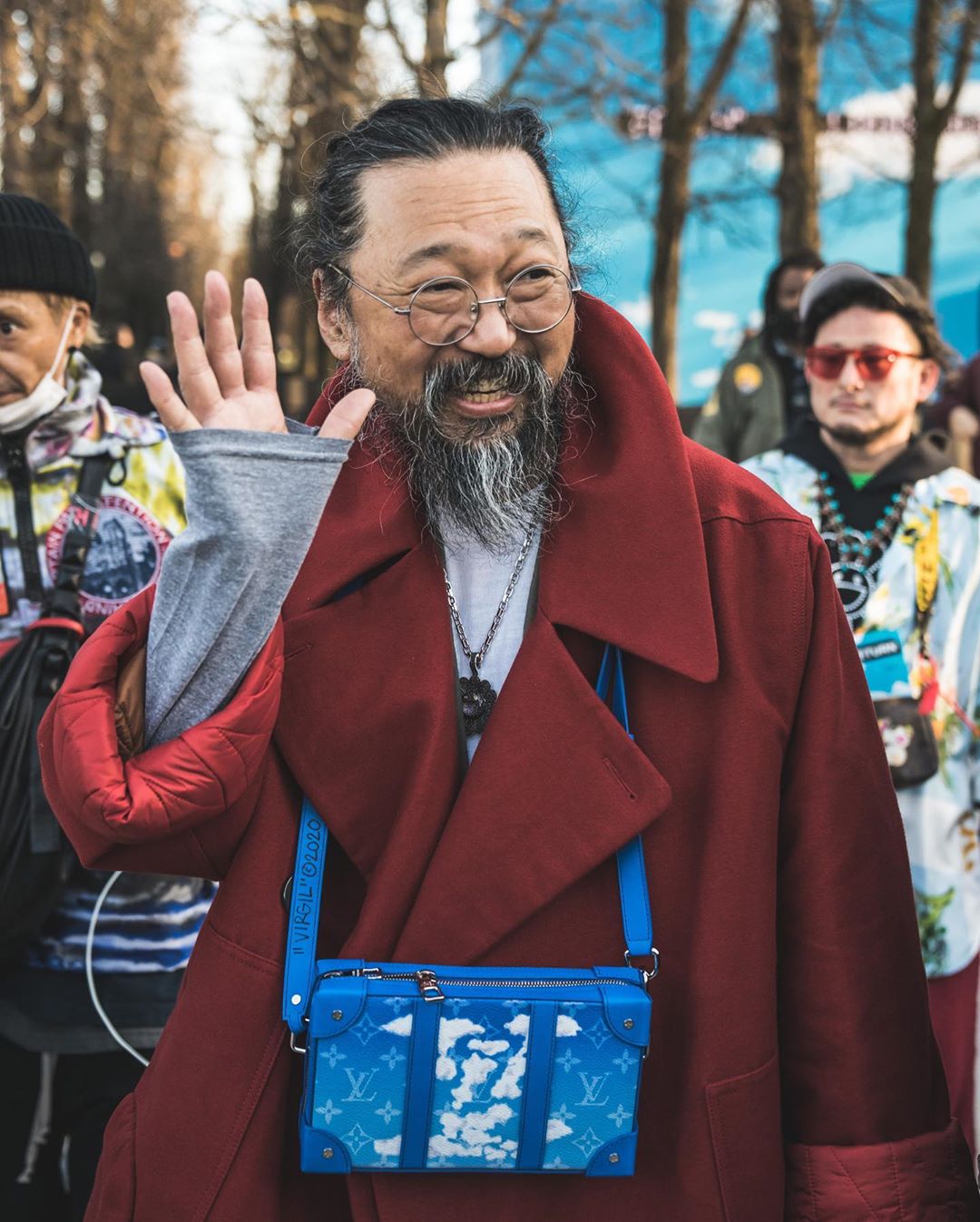 Takashi Murakami, Tyga, Aleali May ou encore J Balvin… La liste des invités n’était pas des moindres et il en va de même pour le défilé qui s’ouvrait sur la performance d’un danseur de claquettes dont les semelles claquaient contre le sol d’un rythme entêtant.