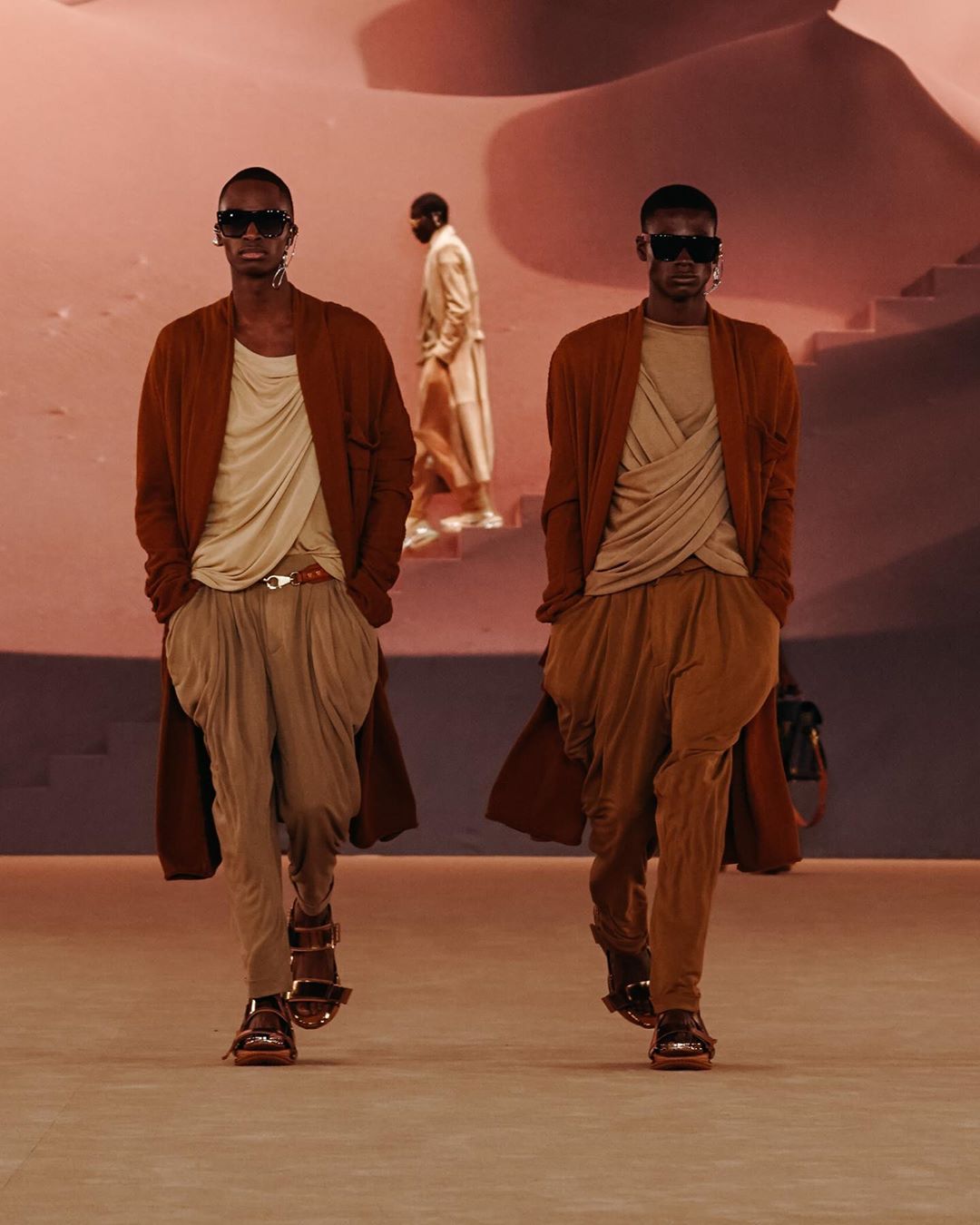 Mais cette collection s’approprie également certains code du vestiaire féminin avec ses jeux de drapés. Offrant des silhouettes hybrides, Kim Jones a su brouiller les frontières du genre.