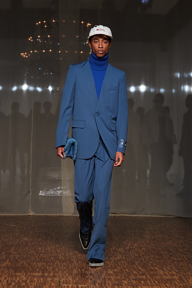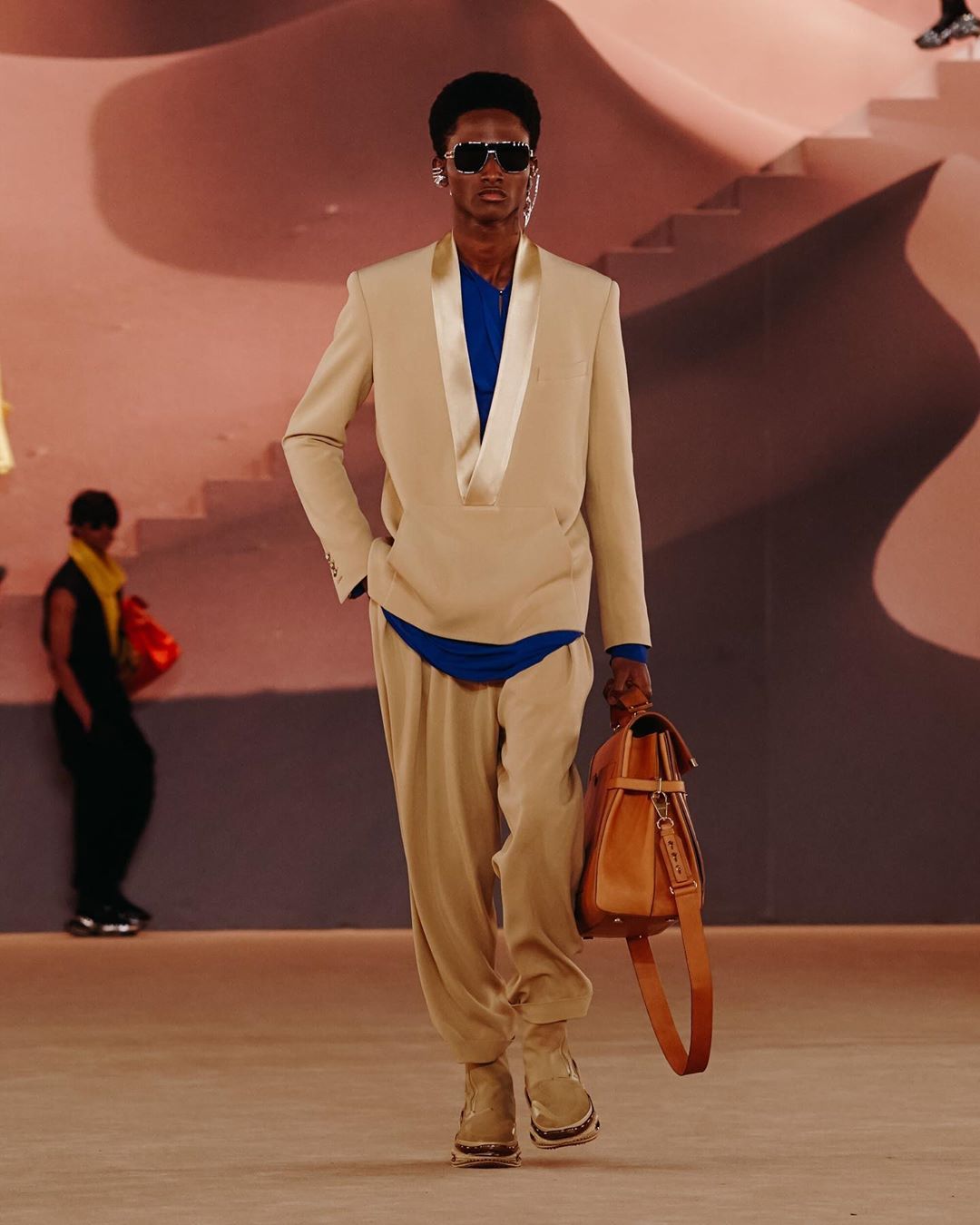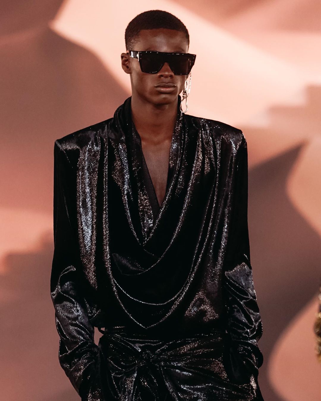 Intitulé « Heaven on earth », ce défilé était un véritable retour aux sources du tailoring. Adieu le streatwear que le designer affectionnait tant… faites place aux vestes de tailleurs et aux costumes en cuir et en broderie anglaise !  Étaient également présents, des sacs aux formes inédites et au surréalisme qu’on retrouve même sur les visages des mannequins, visages recouverts de pièces métalliques !