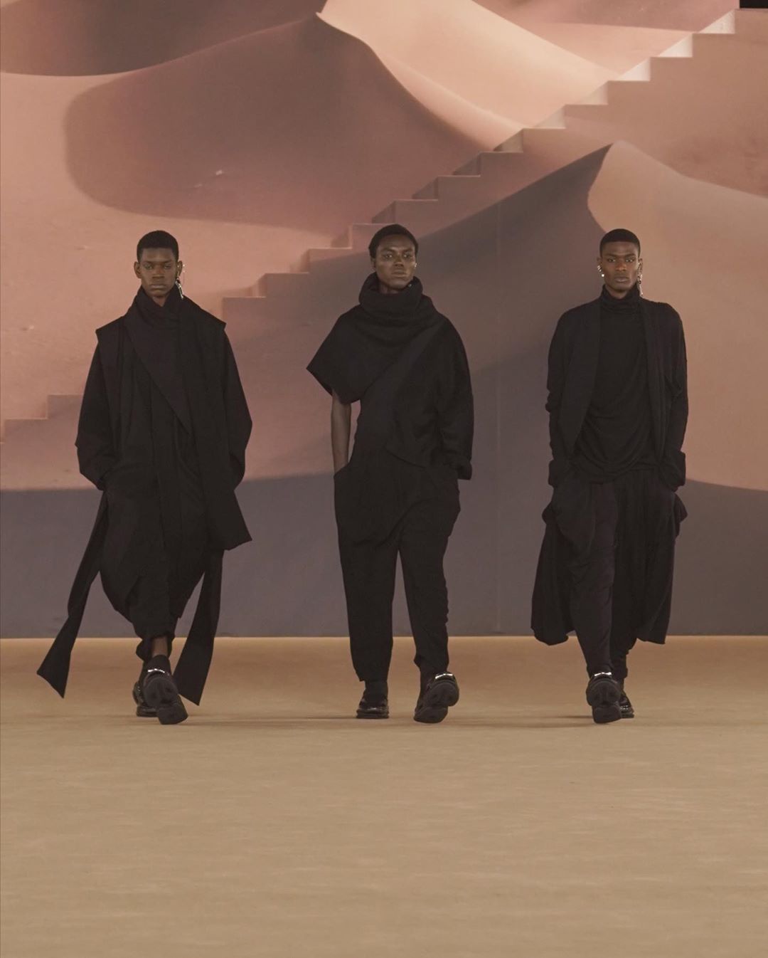 Mais la poésie ne s’arrête pas là puisque le défilé se conclut avec un final des plus beaux. Ce sont des danseurs contemporains aux torses nus et vêtus d’un des pantalons phare de la collection qui clôturent le défilé, suivis du directeur artistique et de ses mannequins.