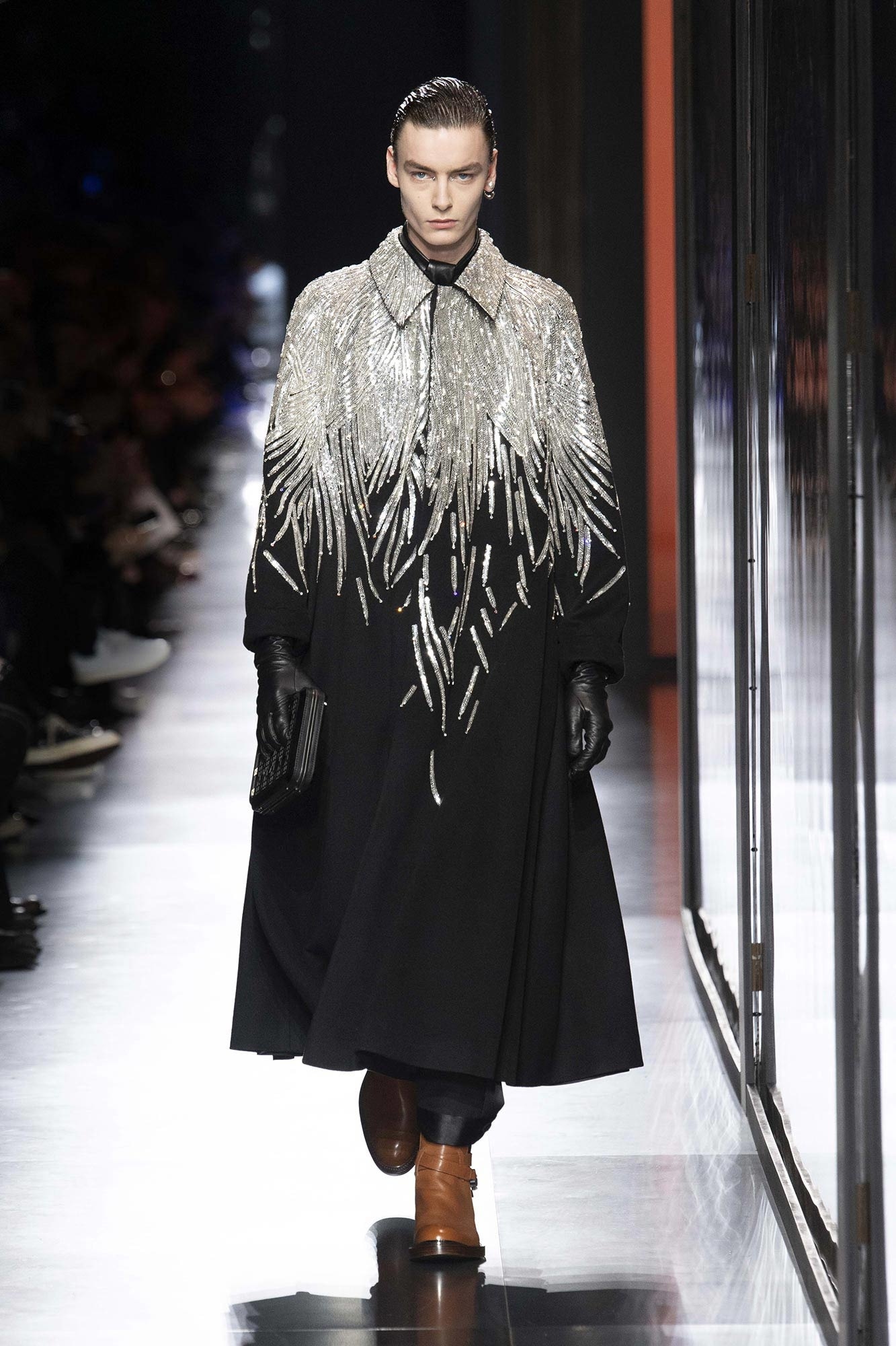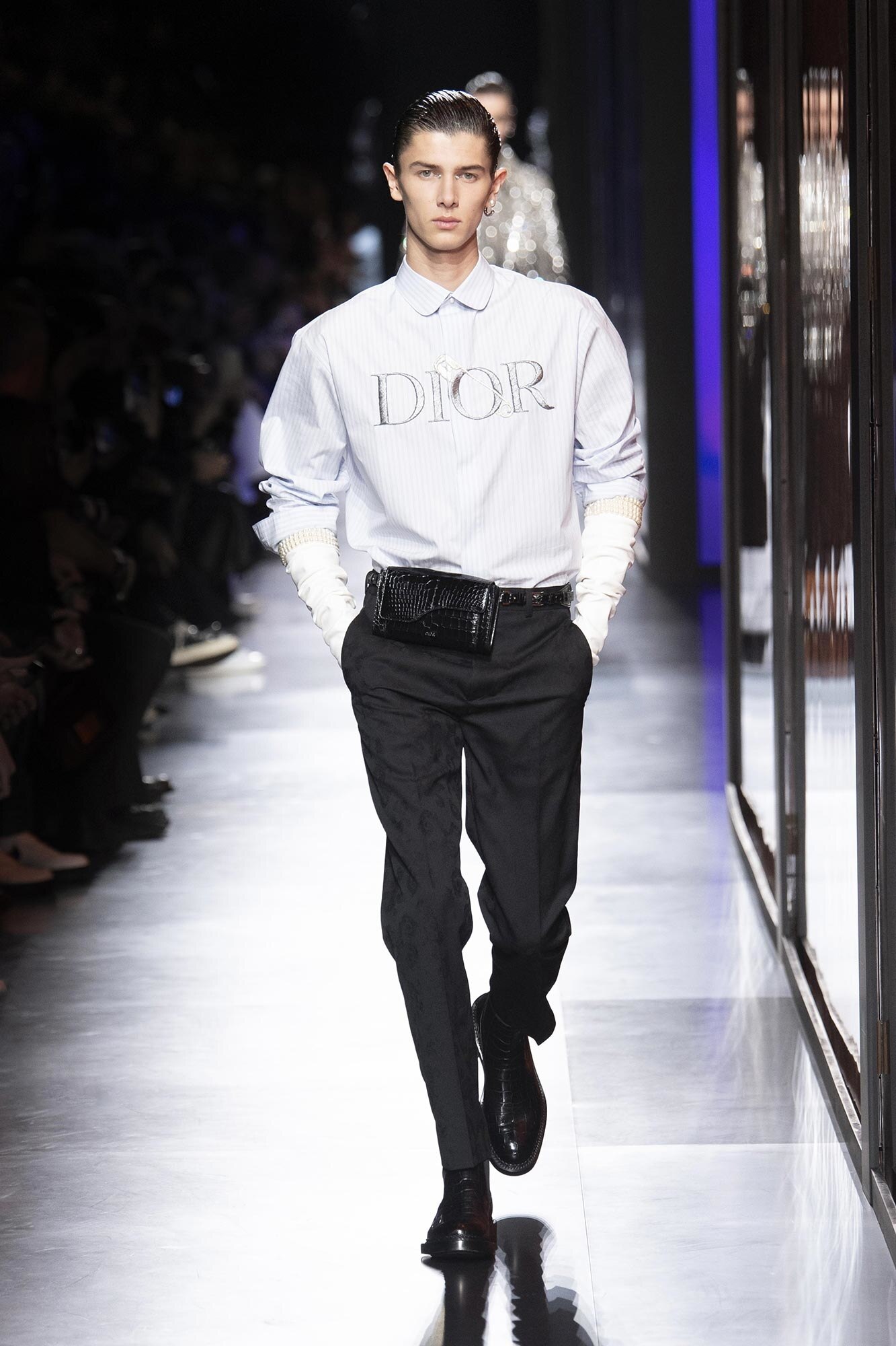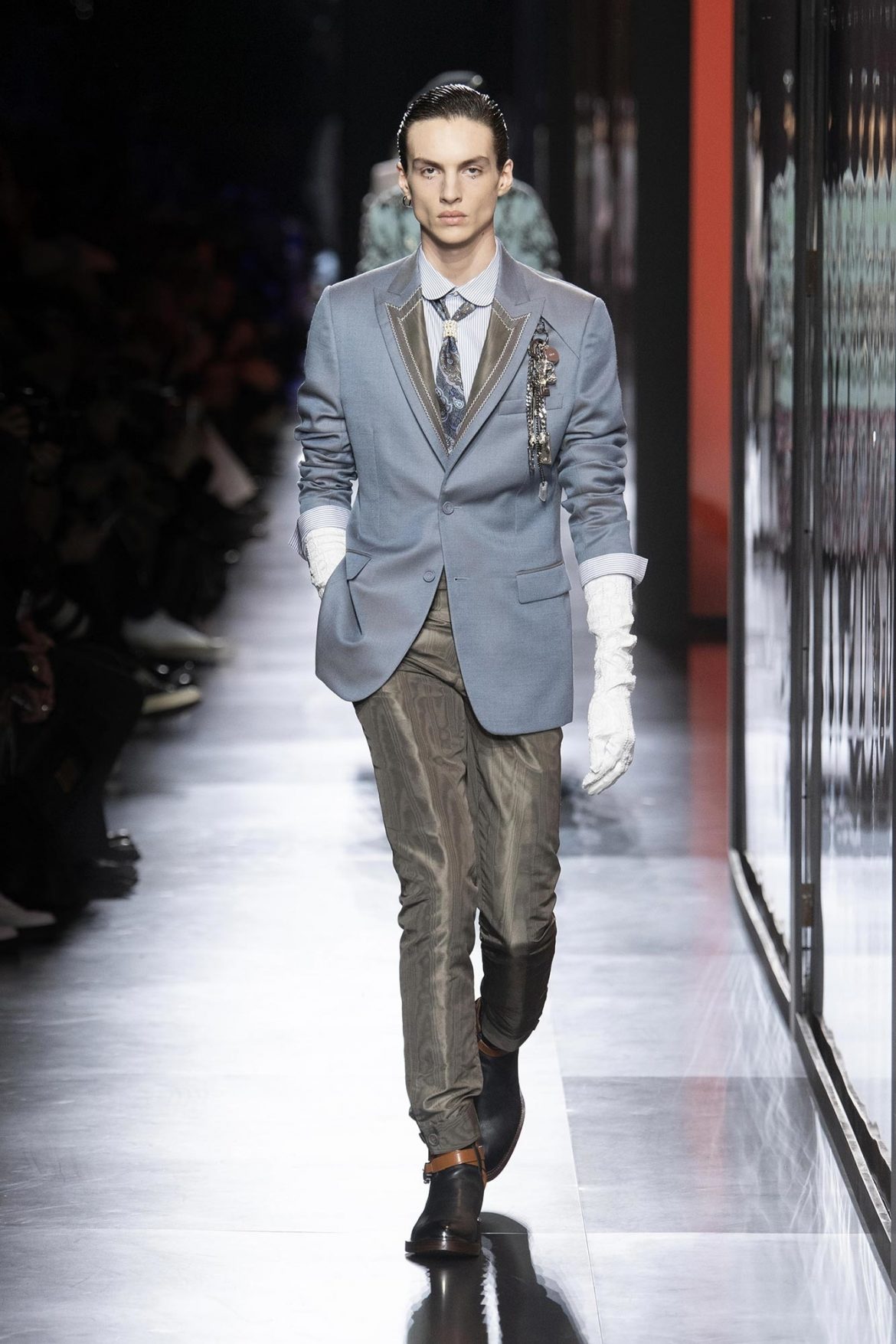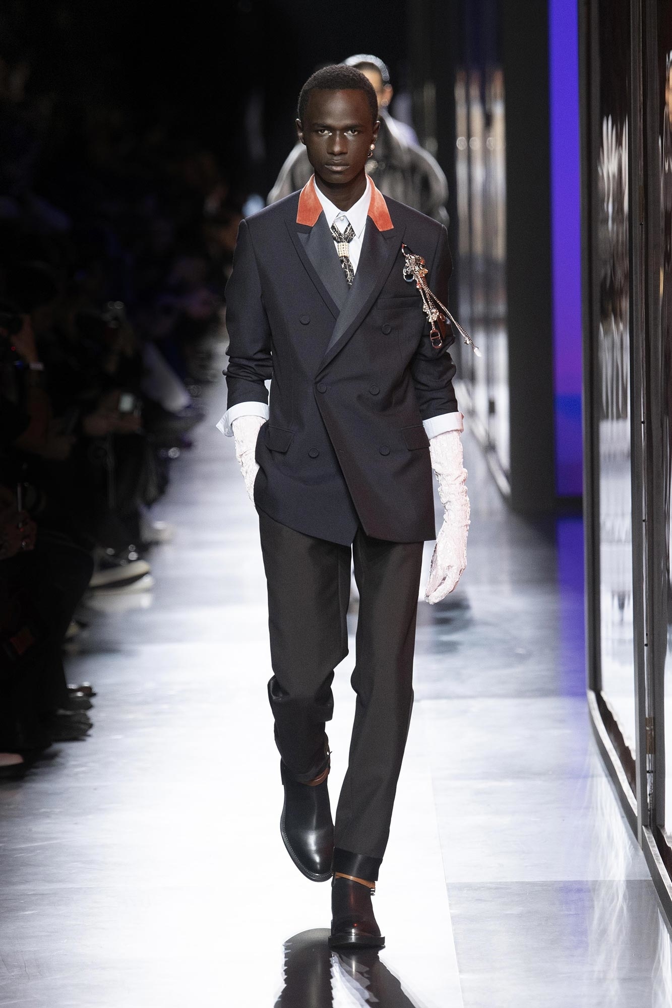 Cette année, Kim Jones nous a présenté une collection dans laquelle on retrouve des épingles à nourrices, des bijoux composés de chaines (made by Yoon Ambush), des pulls élégamment troués… Du punk mais aussi de l’élégance, qu’on retrouve dans les broderies sublimant des gants d’opéra ou dans des smokings !