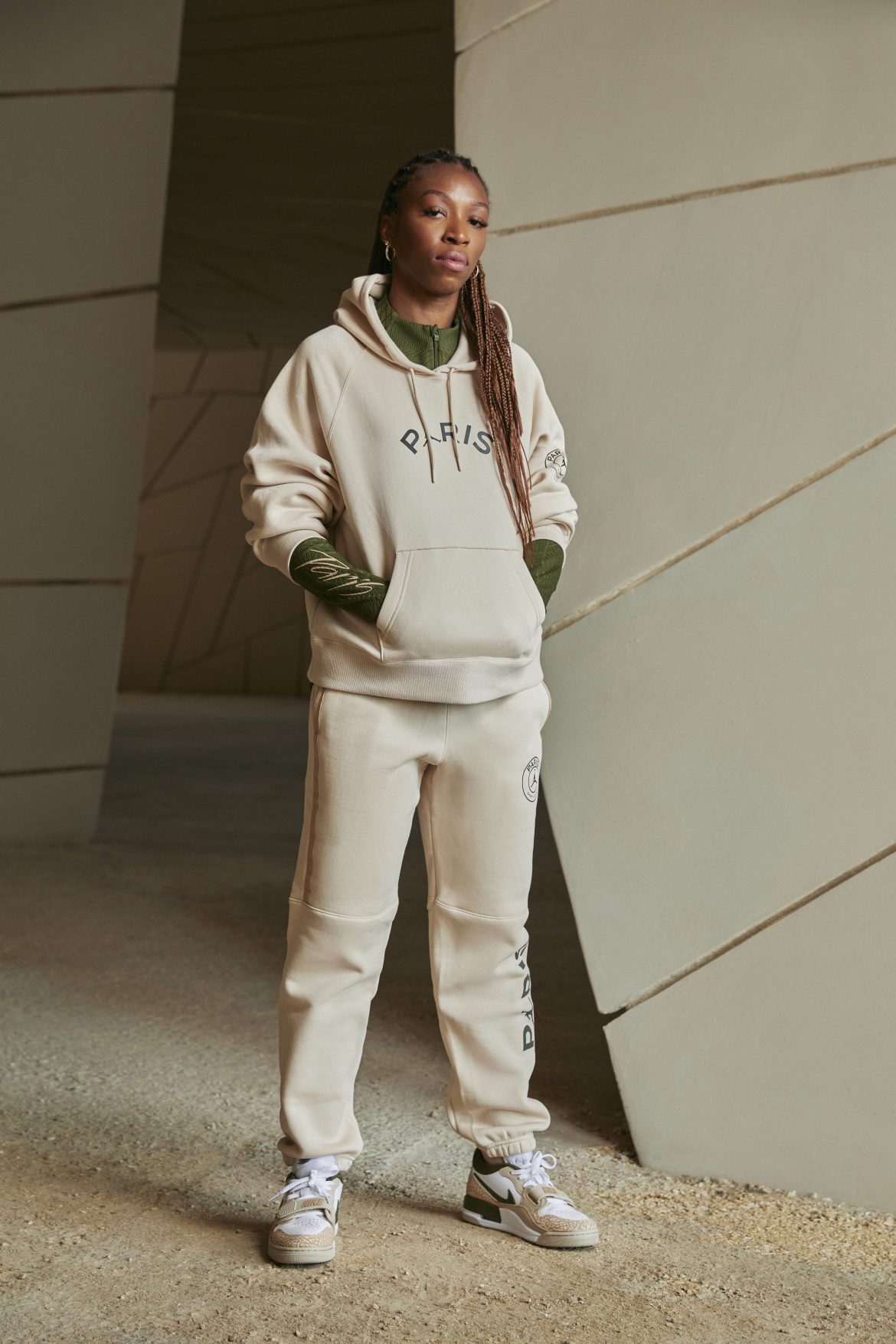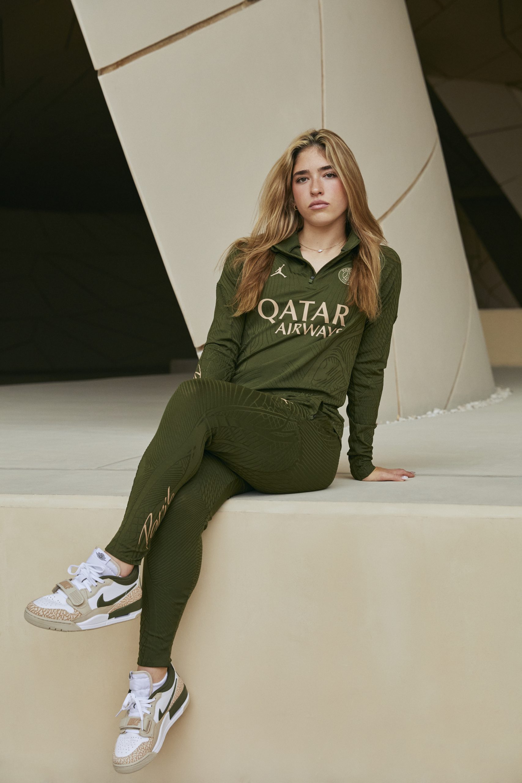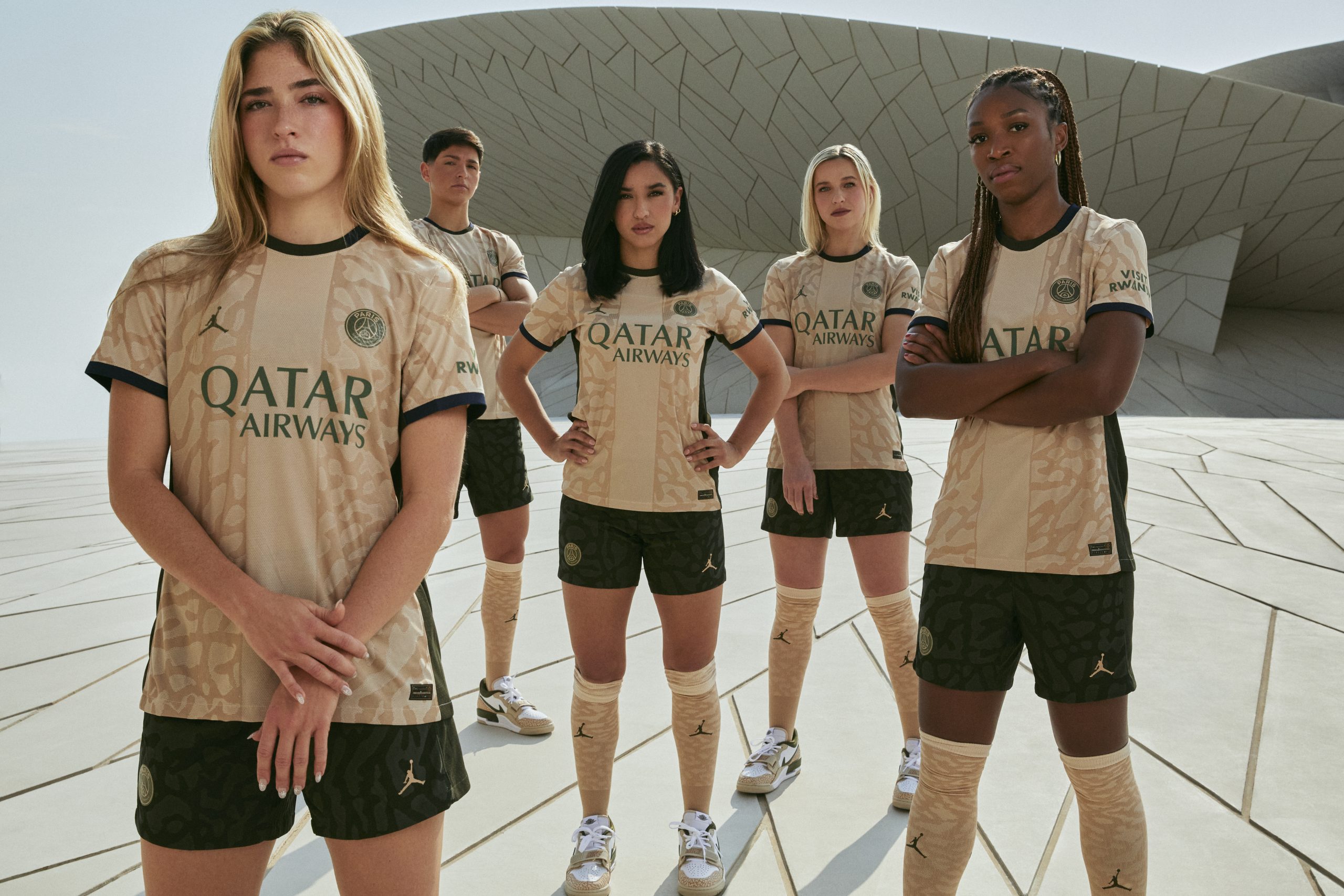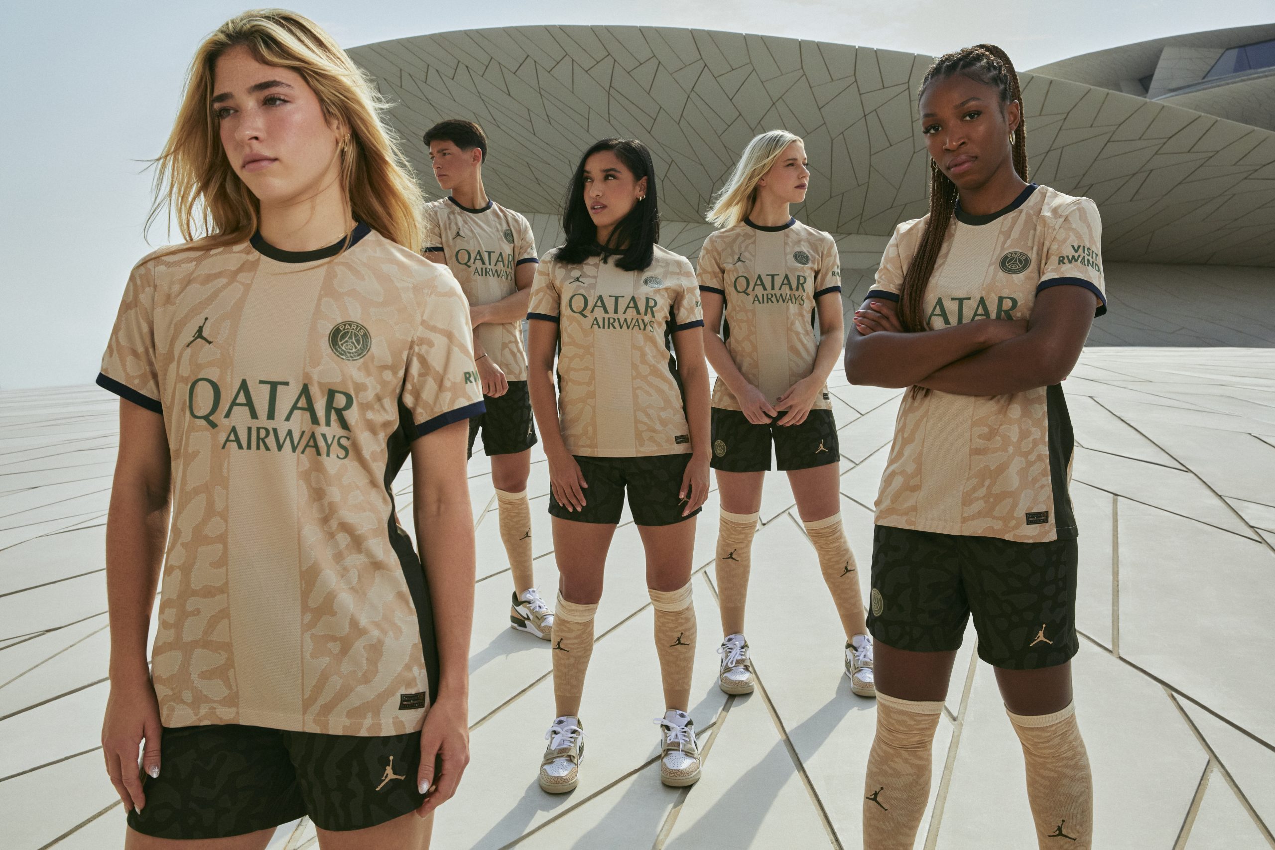 Cette dernière gamme complète le vestiaire 2023/2024 du Paris Saint-Germain et, comme le maillot précédent en collaboration avec Jordan Brand, elle arbore l’emblématique Éléphant Print. Pour cette occasion, les joueuses du Paris Saint-Germain sont l’honneur. Korbin Albert, Elisa De Almeida, Jackie Gronen, Sakina Karchaoui et la capitaine Grace Geyoro se sont rendues au Musée national du Qatar à Doha afin de mettre en valeur ce quatrième maillot. Ce lieu symbolique, dont l’architecture « rose des sables » distinctive a été conçue par l’architecte français Jean Nouvel, offre un cadre visuellement saisissant qui correspond aux couleurs du kit.