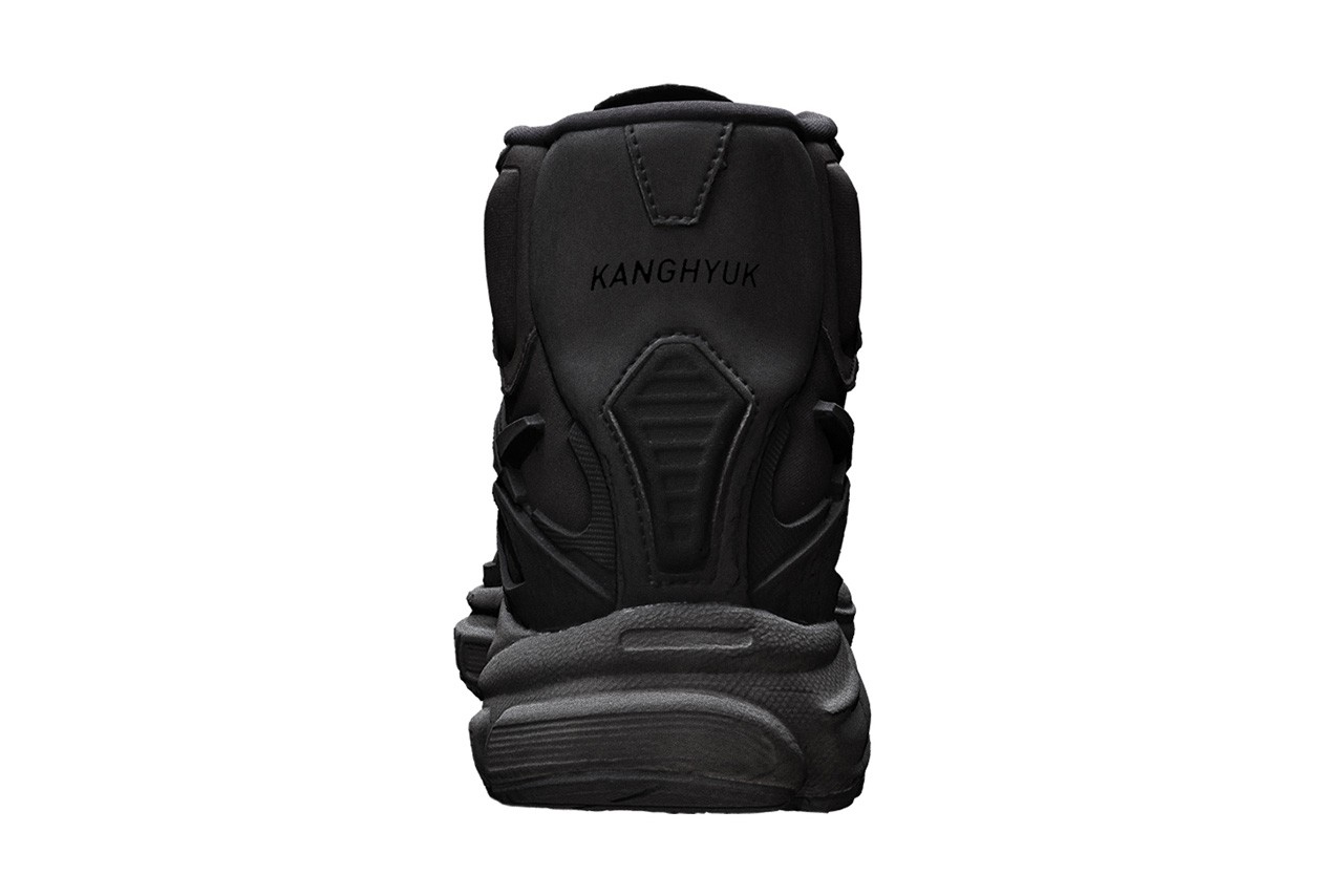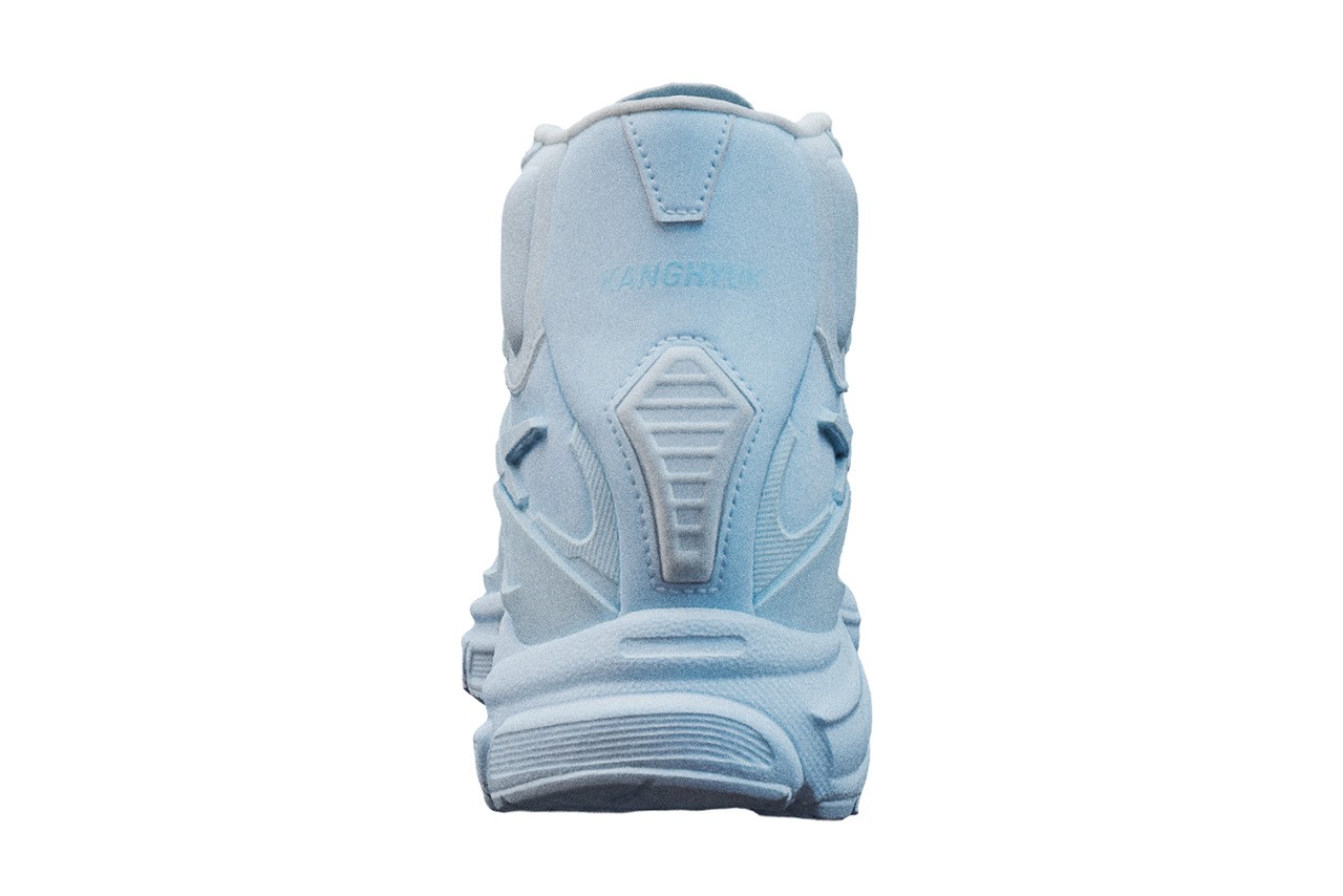 On retrouve dans un premier temps une version entièrement noire, sombre et parfaite pour l’hiver. La seconde, elle, se couvre d’une robe bleutée parfaite pour le printemps et l’été. Les paires sont équipées de la semelle EVA ainsi que de renfort au niveau de la cheville pour un confort optimal. Enfin, KANGHYUK appose son logo au niveau du talon en ton sur ton.