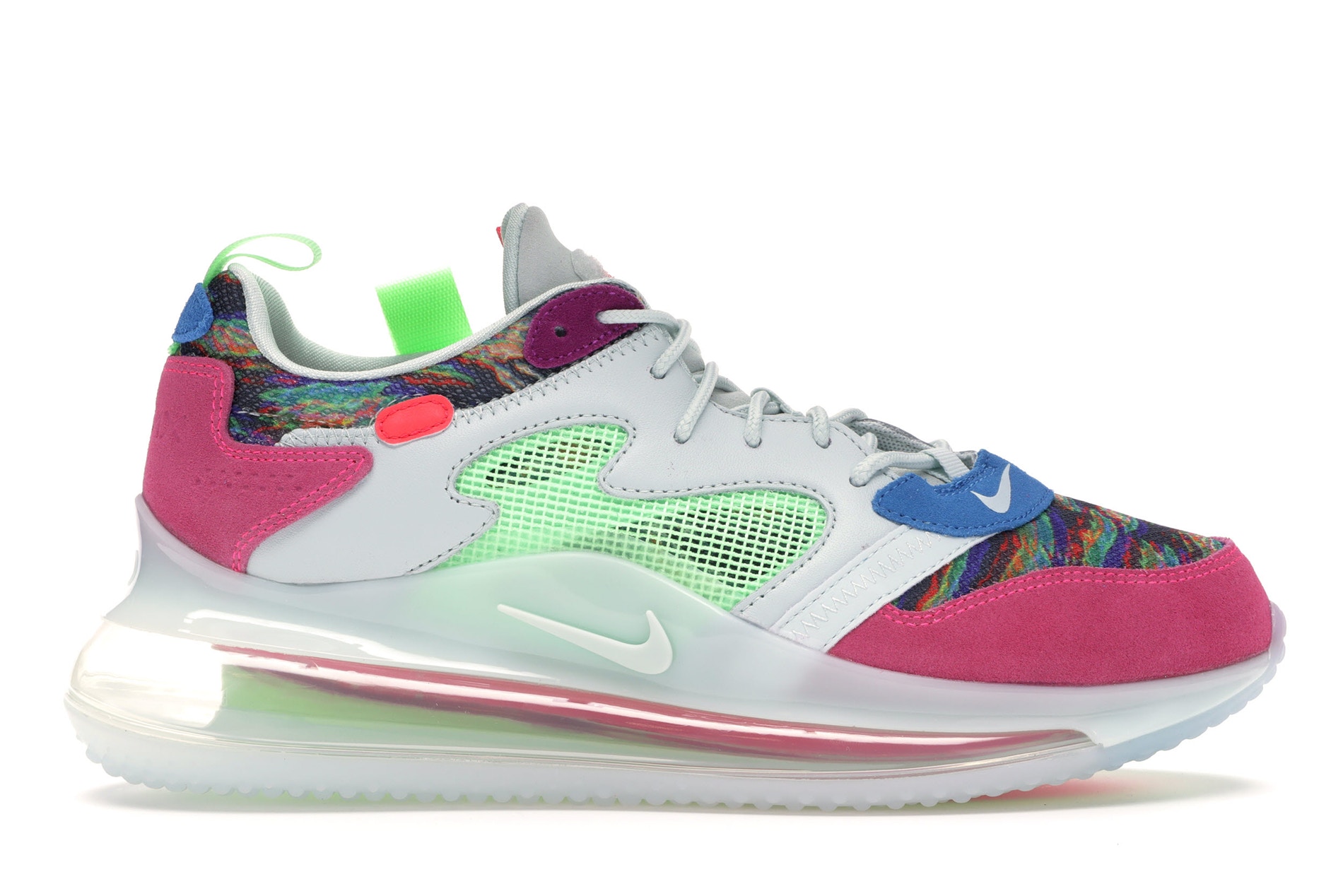 Comme son concurrent allemand, le géant américain nous offre une nouvelle collaboration pour ce week-end. Seulement quelques jours après la nouvelle de son départ des New York Giants pour les Cleveland Browns, Odell Beckham Jr s’est associé à la marque au swoosh pour nous proposer cette Air Max 720 « King Of The Drip ». C’est avec des matériaux tels que du daim et du mesh que la paire composée de blanc comme couleur principale, de touches de rose, de bleu mais aussi un imprimé multicolore sera vendue ce vendredi 21 Juin sur le site de Nike et chez les principaux retailers au prix de 200 €.