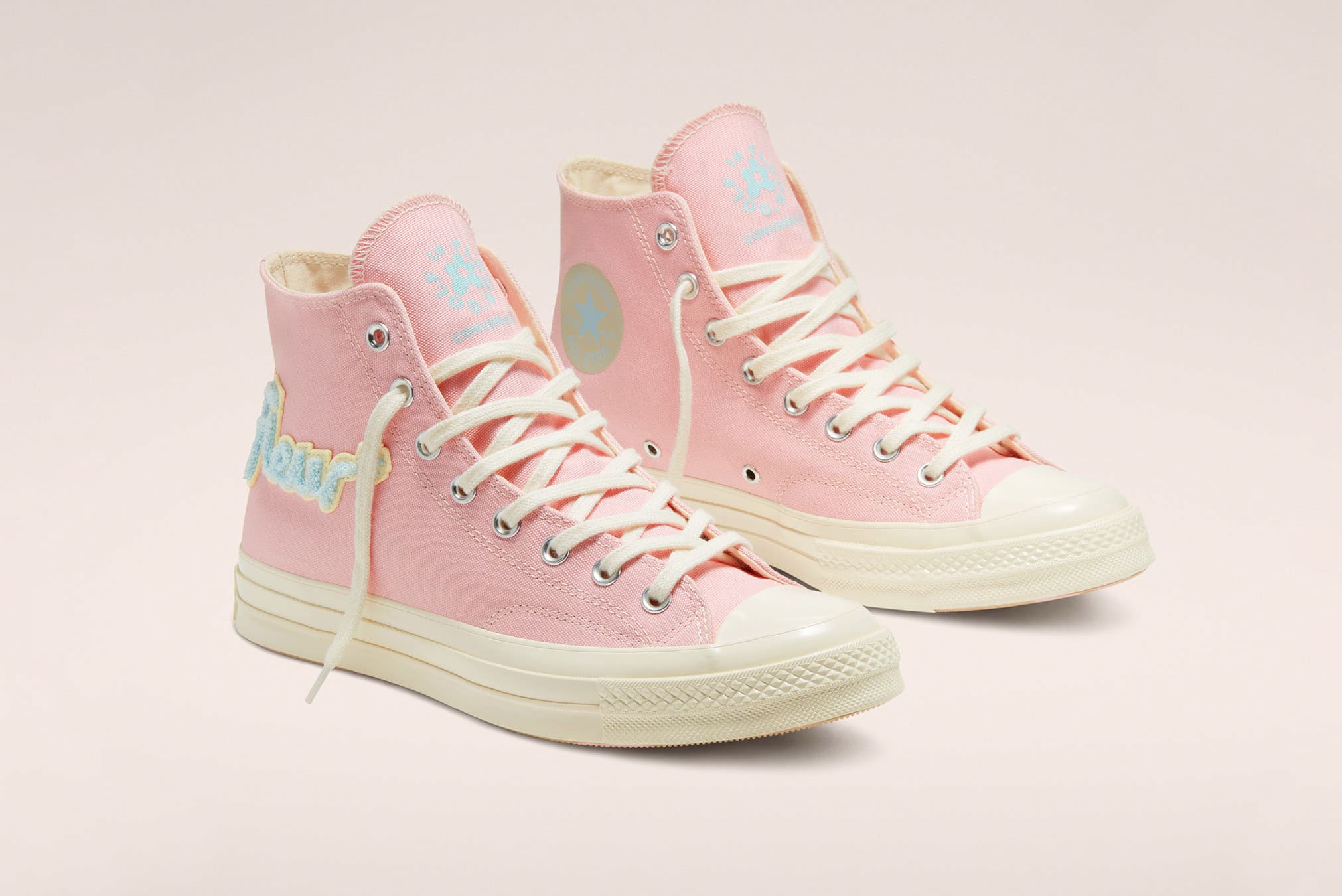 Tyler The Creator et Converse collaborent une nouvelle fois afin de présenter la Golf Le Fleur x Converse Chuck 70 Chenille cet hiver. La paire habillée en canvas rose possède de nombreux détails comme les inscriptions Golf Le Fleur sur le talon, le logo All Star sur l’intérieur ainsi que des fleurs sur la semelle extérieure, signature de Tyler. La Golf Le Fleur x Converse Chuck 70 Chenille sera disponible le 13 décembre sur le site Converse ainsi que chez certains retailers au prix de 110 €.