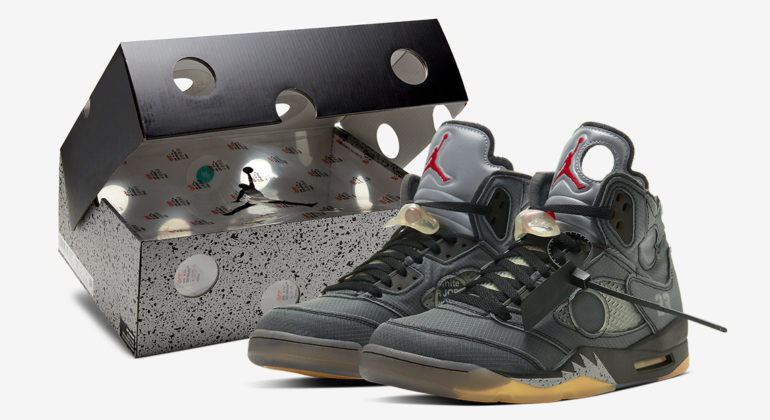 Après plusieurs Air Jordan 1, Off-White et Jordan Brand ont collaboré sur un modèle un peu moins populaire, la Air Jordan 5 . La paire, habillée de gris, de noir ainsi que de 3M, possède également une icy-sole jaunie ainsi que plusieurs détails comme un trou dans la languette gauche, l’incontournable zip-tie ou encore le logo Nike Air sur le talon de la chaussure. La paire sortira le 15 février sur le site Nike ainsi que chez quelques retailers au prix de 200 €.