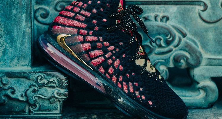 Nike LeBron 17 CourageAvec la reprise de la saison régulière de NBA qui approche, LeBron James et la marque au Swoosh dévoilent ce week-end la Nike LeBron 17 Courage. La paire est principalement de composée de knitposite noir et rouge mais possède également quelques détails dorés ainsi qu’une unité Air-Sole sur la semelle. La Nike LeBron 17 Courage est disponible depuis hier sur le site Nike chinois.