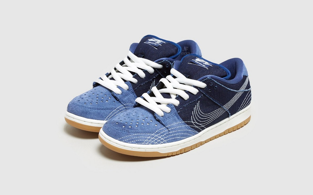 La marque au Swoosh s’est inspirée de la technique de broderie japonaise « Sashiko » et nous présente une SB Dunk Low qui porte le même nom. La paire est composée de denim bleu, de suede bleu clair ainsi que d’une midsole blanche avec une outsole gum. On remarque un Swoosh et des ondulations en surpiqures blanches. La Nike SB Dunk Low Sashiko sortira le 1er août chez quelques skateshops sélectionnés par Nike au prix de 100 €.