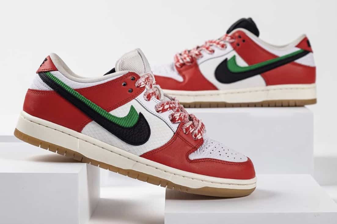 Nike et Frame Skate, le skateshop situé à Dubaï, dévoilent cette semaine leur nouvelle collaboration ! Inspirée du drapeau de Dubaoïote, ce nouveau coloris est vêtu de cuir blanc et rouge ainsi que de détails verts et noirs. On remarque également des lacets bicolores ainsi qu’une outsole gum. La Frame Skate x Nike SB Dunk Low Habibi sortira le 5 décembre sur l’application Nike SNKRS et chez quelques skateshops.