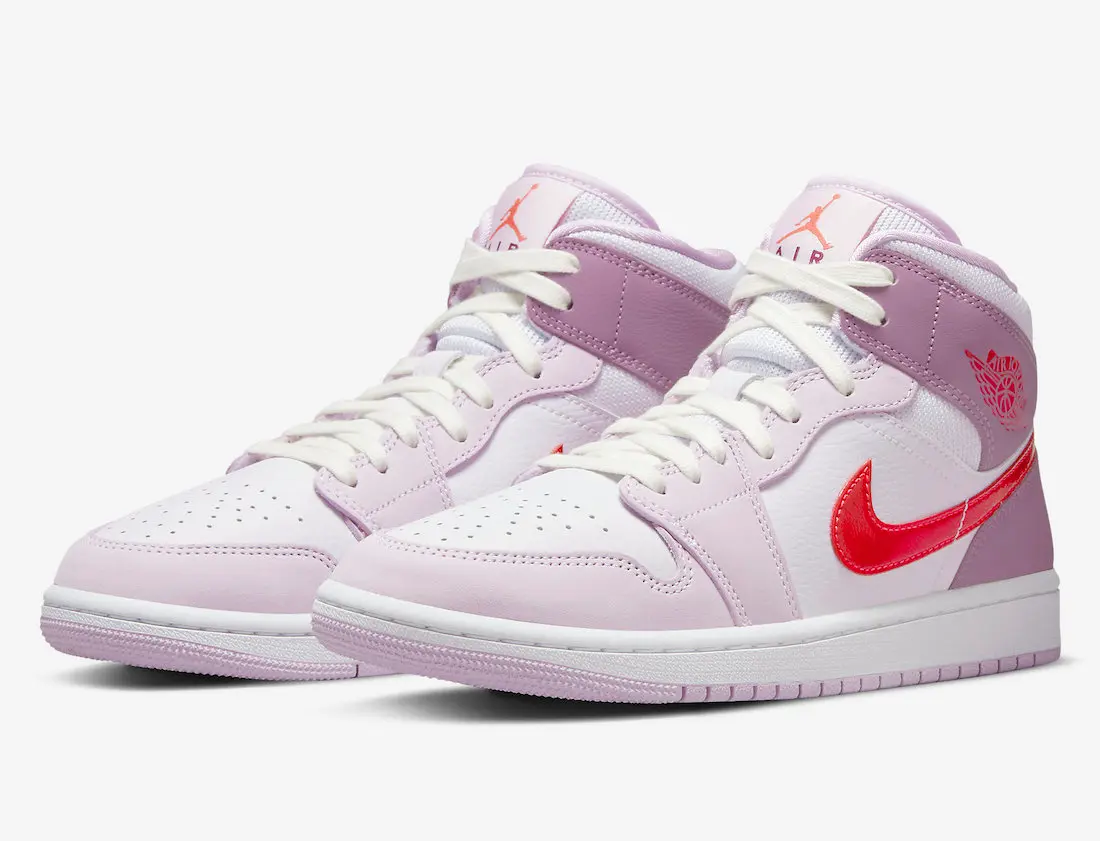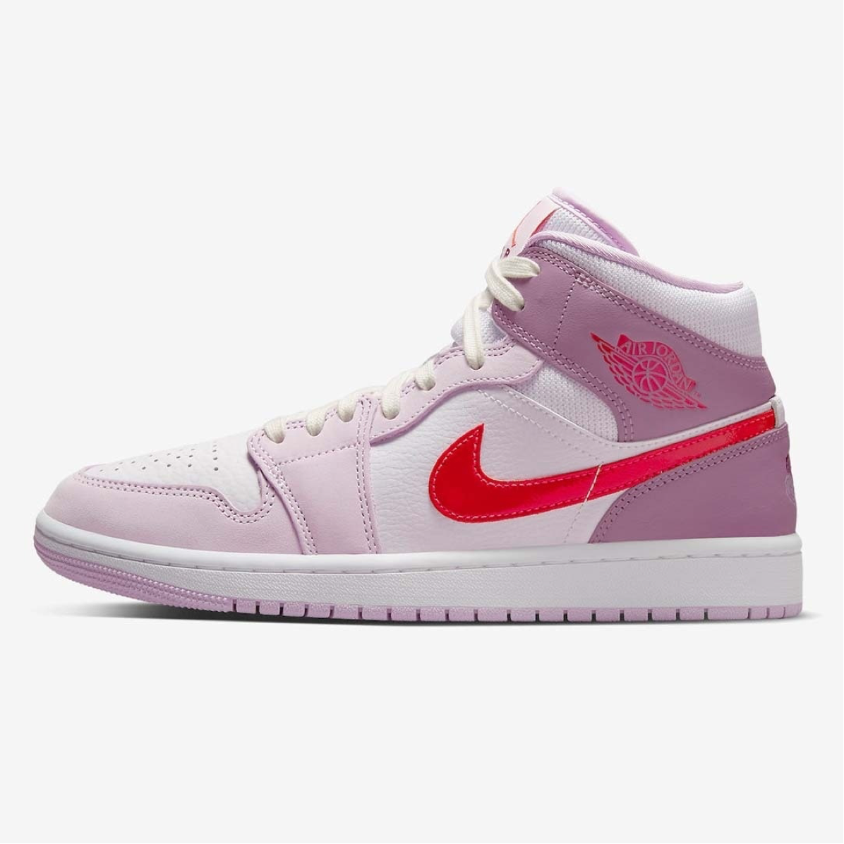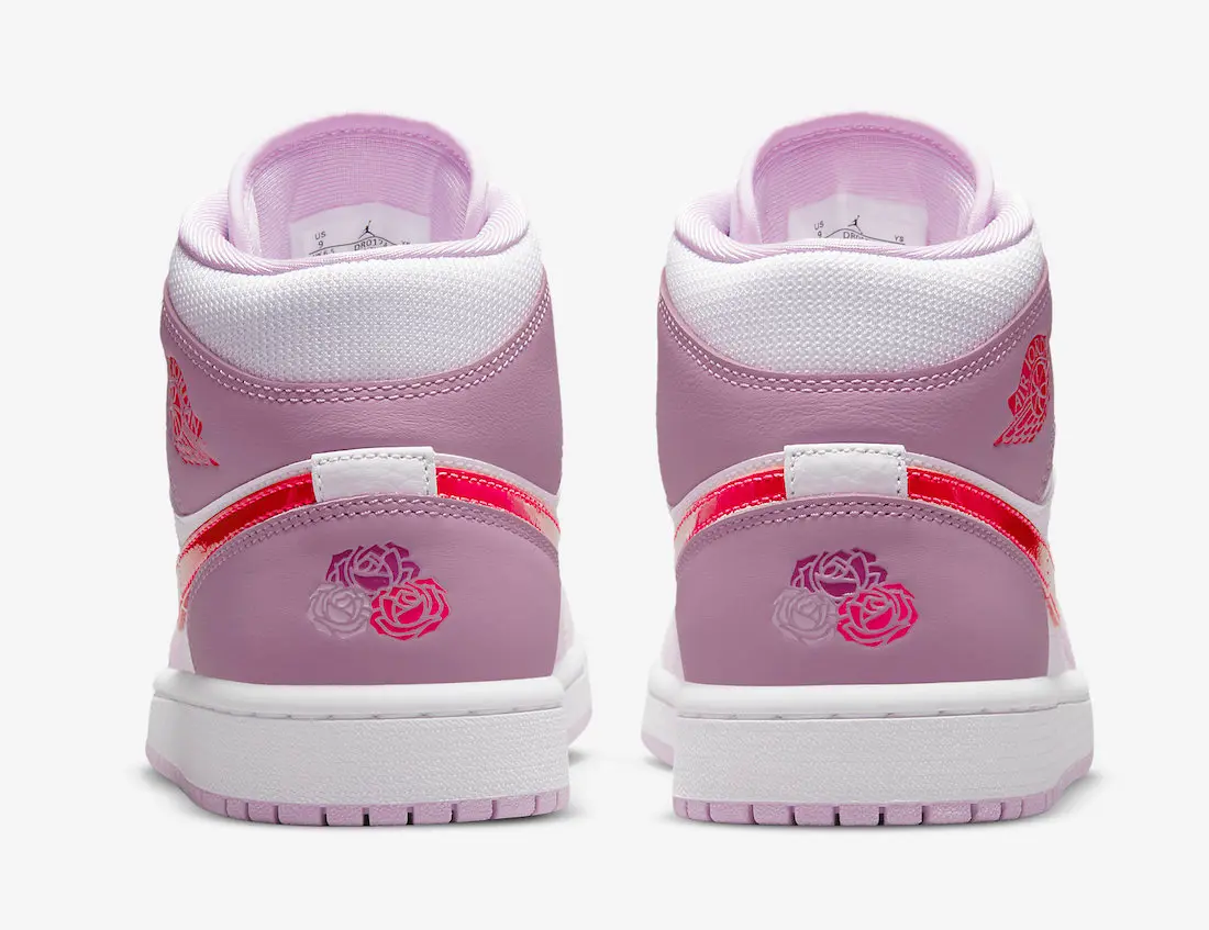 Sûrement l’un des modèles les plus appréciés ces derniers temps : la Air Jordan 1 Mid, dans des tons un peu plus sobres que les précédents. Une base en cuir grainé blanc, des empiècements mauves et lilas, un swoosh rose brillant et le tour est joué ! La paire se compose d’une midsole blanche et une outsole lilas pour faire le rappel. Sur le talon, trois roses sont brodées en référence aux différentes teintes.