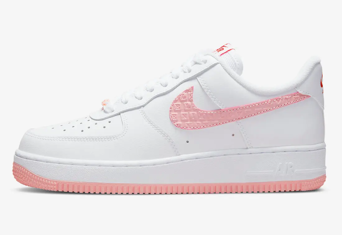 Pour finir chez Nike, on attend comme tous les ans une Air Force 1. Une paire qui reste assez discrète et sobre avec une base en cuir blanc et une outsole rose pâle. Le swoosh comporte des imprimés « Nike » et « Love » ton sur ton qui font un rappel avec la couleur de l’outsole. Enfin, comme ses soeurs, des lacets originaux avec des petits accessoires dotés d’une touche de rouge sont à retrouver avec la paire. Tout comme sur le branding de la languette.