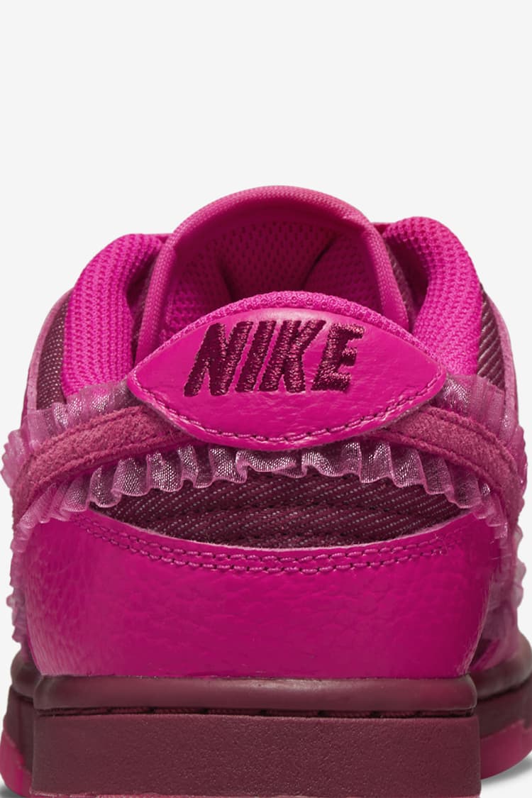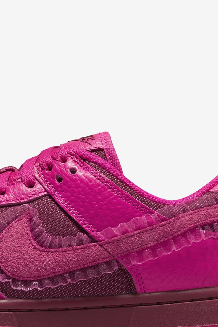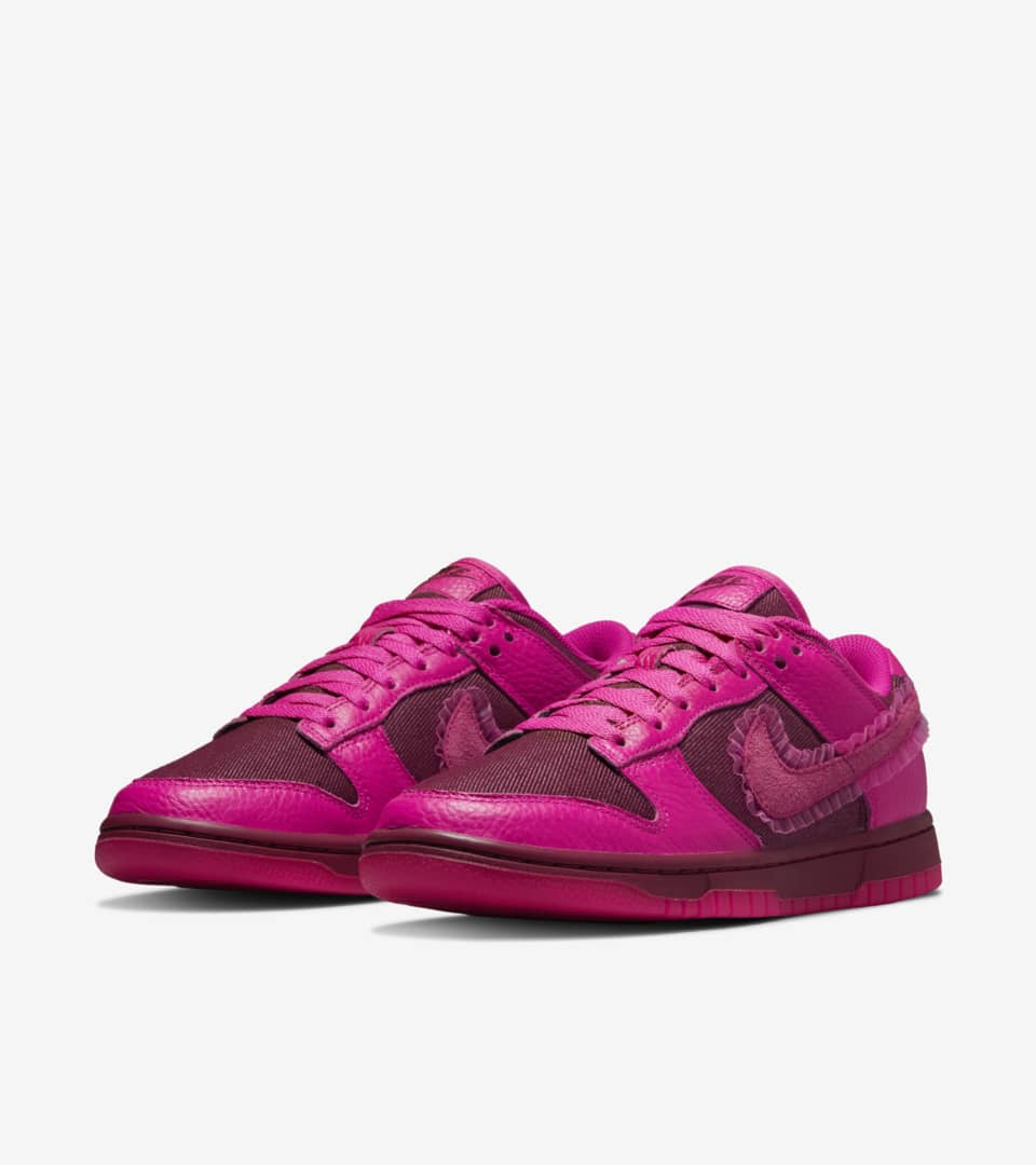 Poursuivons avec une Dunk Low, qui présente une base en twill bordeaux faisant office de contraste avec les empiècements en cuir grainé rose. Elle se différencie par son swoosh en nubuck, entouré de dentelle rose. En rappel, on remarque une midsole bordeaux mais aussi une outsole dans un rose translucide. Pour finir, comme sur la Air Max 90, elle dispose aussi des lacets roses.