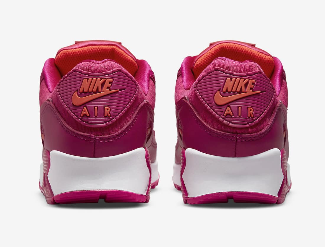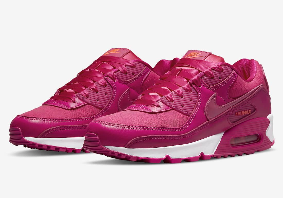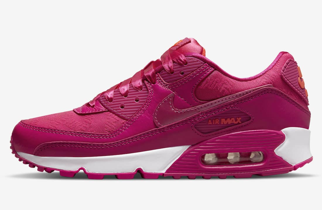 Pour commencer, nous retrouvons la fameuse Air Max 90 dans un coloris entièrement fuchsia. Elle dispose d’une base en tissu avec un imprimé « Nike » ton sur ton sur la toebox et l’arrière de la paire ainsi que des empiècements en cuir. Néanmoins, sur la midsole on remarque une petite touche de blanc qui vient contraster avec l’uniformité de la paire. De même avec les brandings orange. Enfin, des lacets en satin viennent finaliser le look.