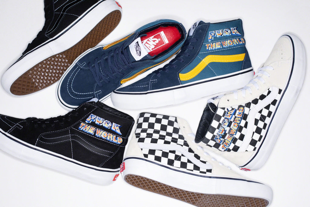 Au programme de cette collection avec Vans, une paire d’un modèle emblématique de la marque : la Vans SK8 Hi-Pro. La paire reprends le logo Fuck The World de Supreme et sera disponible en trois colorways.
