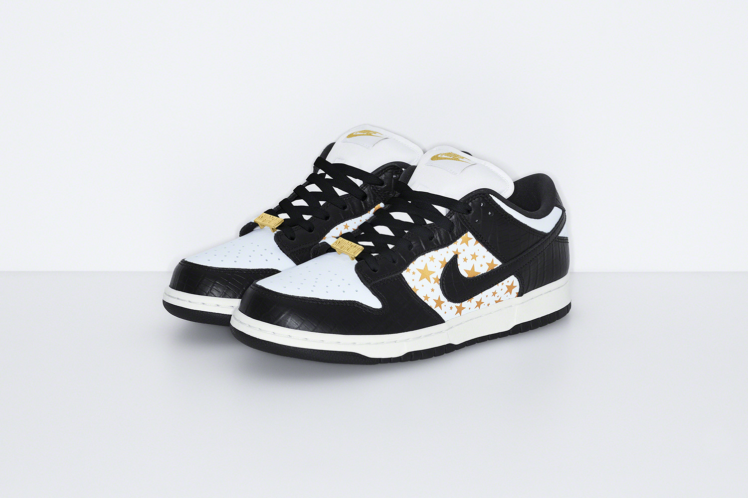 Les quatre Supreme x Nike SB Dunk Low qui sortiront jeudi prochain reprennent les motifs étoilés du pack original. Toutefois, les nouvelles éditions se pareront d’Hyper Blue, de Mean Green, de Black et de Barkroot Brown. Languettes assorties, cuir blanc façon croco et co-branding viendront compléter cette réédition.