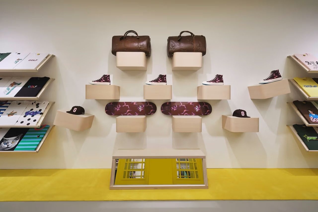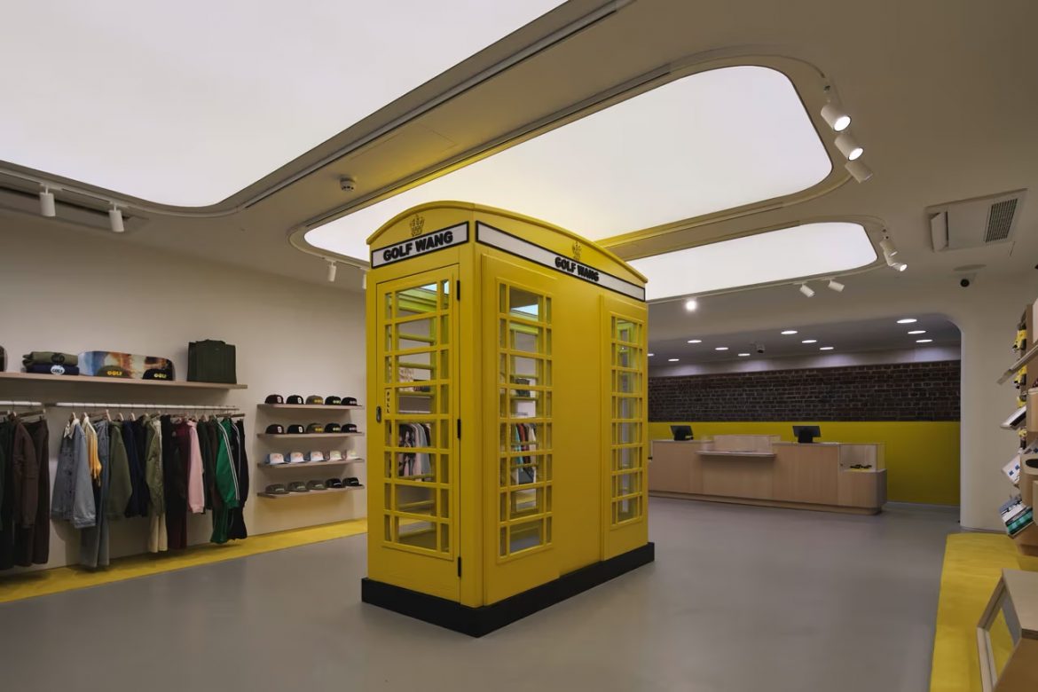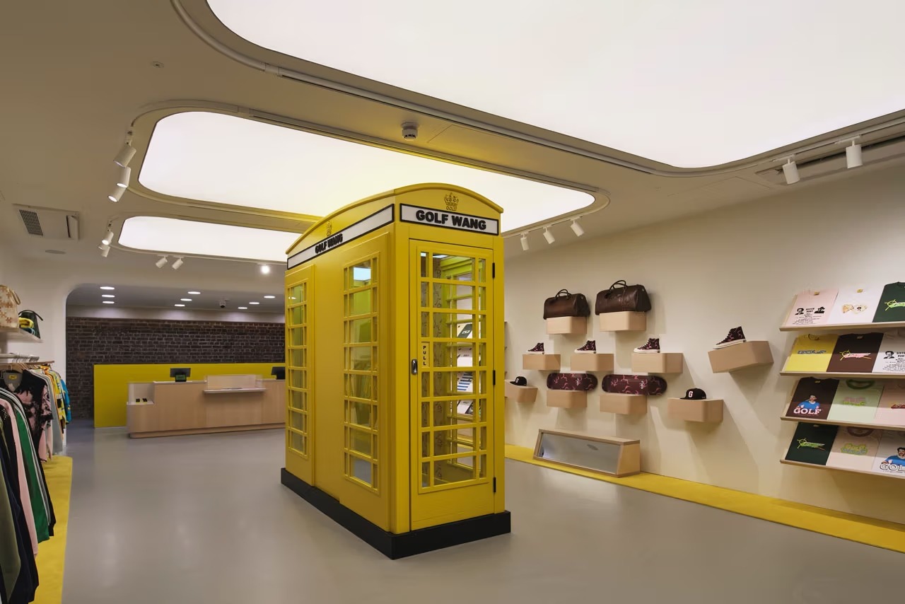 La nouvelle boutique GOLF WANG offre une gamme diversifiée de vêtements et d’accessoires, des t-shirts graphiques et des sweats à capuche aux baskets originales, aux sacs et aux skateboards. L’aménagement intérieur de l’espace reflète le style excentrique de la marque avec des bandes de moquette jaune pissenlit, des murs de tons neutres et une cabine téléphonique britannique en jaune pissenlit, qui trône au centre du magasin.